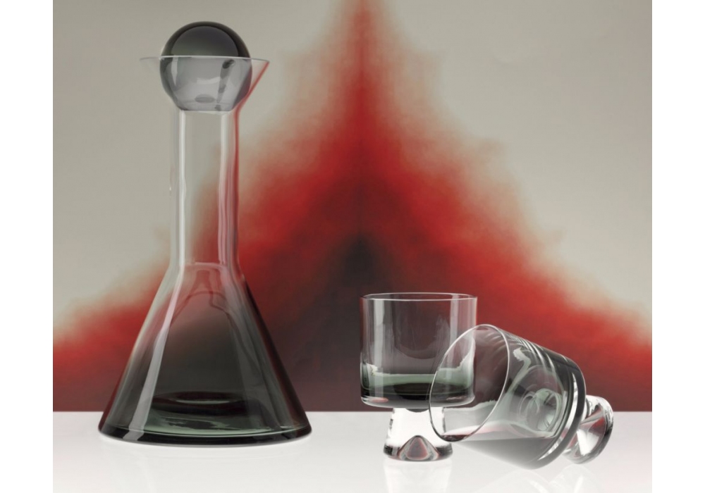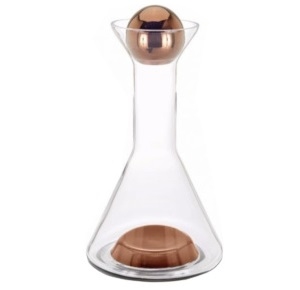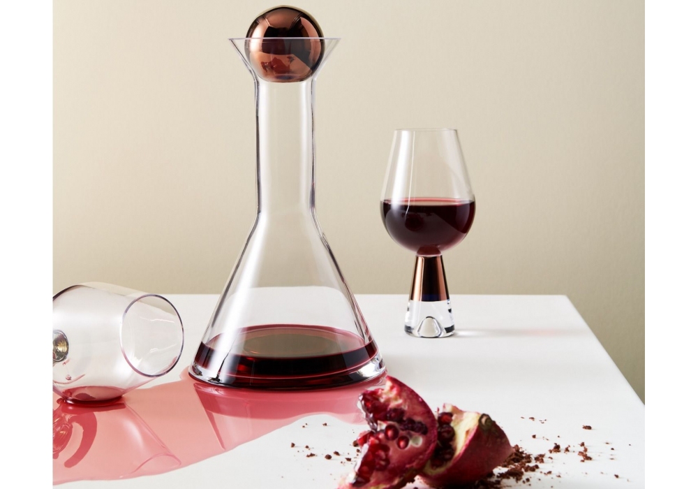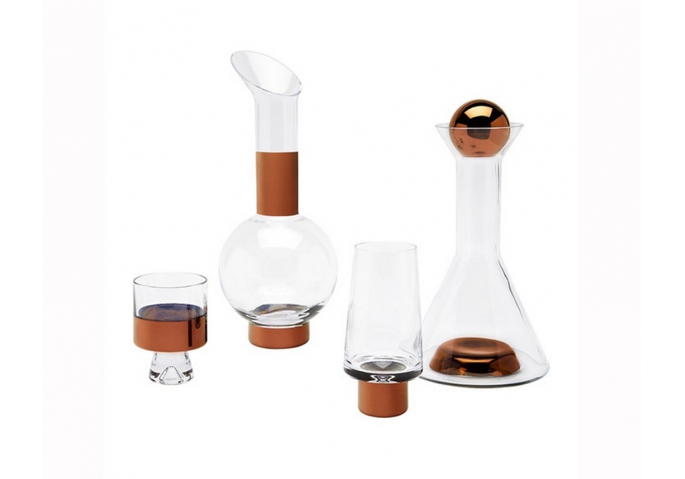 Tank conçue par Tom Dixon est une carafe en verre soufflé transparent, détails disponibles en finitions cuivre ou noir.