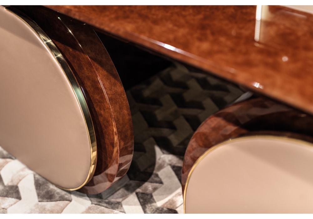 Vogue conçu par Andrea Bonini pour Turri est un bureau avec structure en MDF, contreplaqué et panneaux de particules en finition laquée brillante avec revêtement en cuir brodé. Disponible dans la version avec façade ouverte ou fermée. Il y a un presse-étoupe sur le dessus.