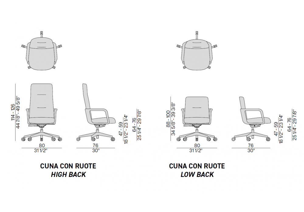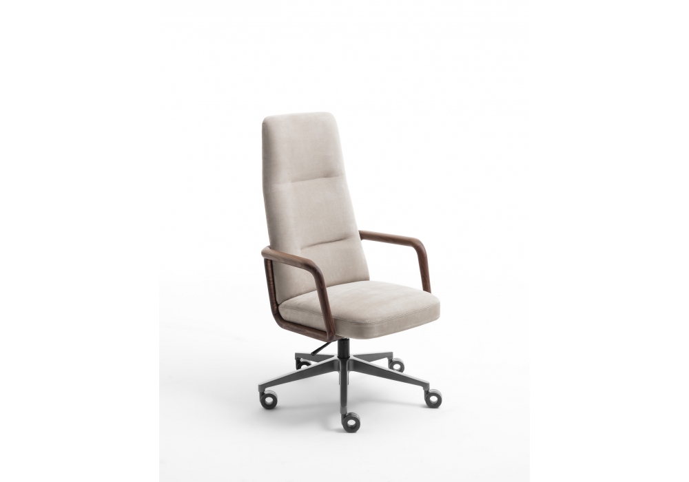 Cuna conçu par E. Gallina pour Porada est un fauteuil de direction à mouvement synchronisé doté d'un piètement métallique pivotant à 5 branches sur roulettes. La structure interne du dossier et de l'assise est en contreplaqué. La coque externe est en noyer canaletta massif avec accoudoirs intégrés. La hauteur de l'assise et la résistance du dossier sont réglables.