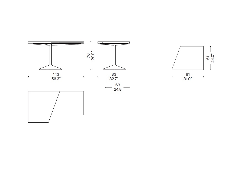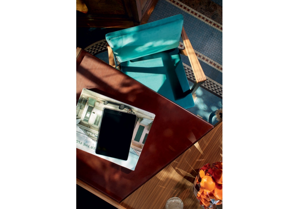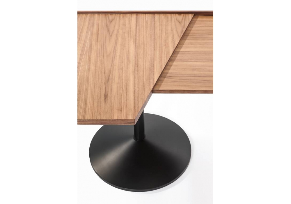840 Stadera conçu par Franco Albini pour Cassina est un bureau réalisé avec un pied en acier tubulaire, deux plateaux adjacents de forme trapézoïdale en noyer Canaletto naturel et un accessoire en cuir.