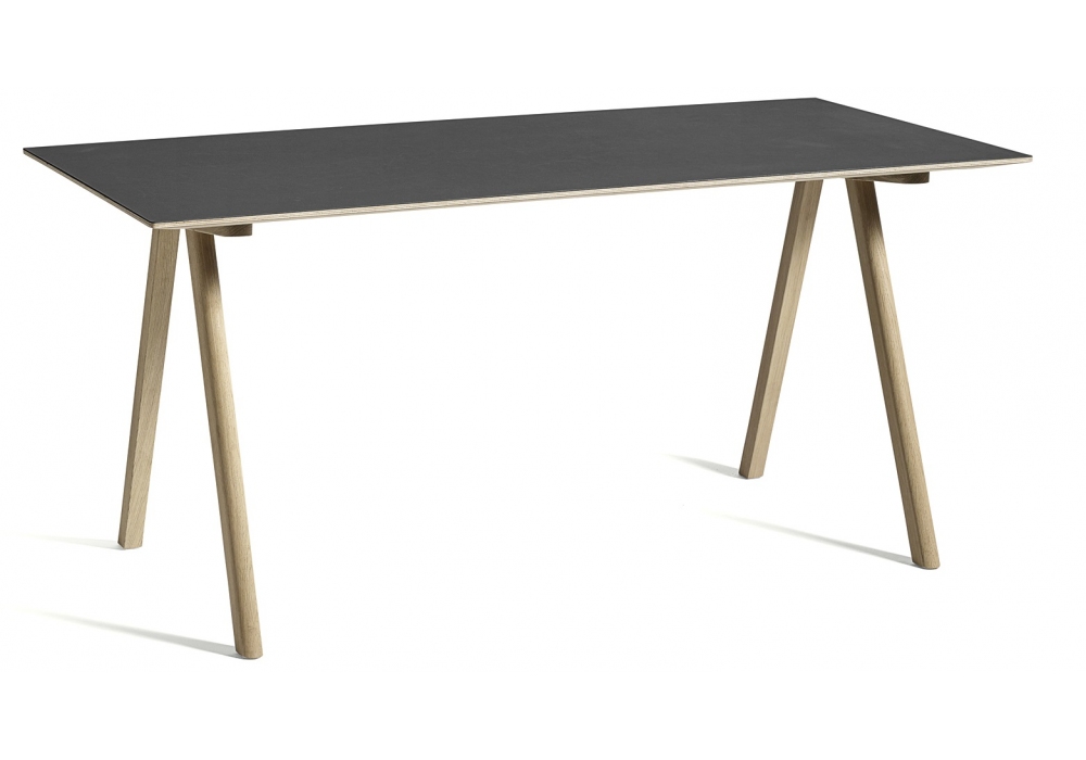Copenhague Desk CPH10 conçu par Ronan et Erwan Bouroullec pour Hay est un bureau avec plateau en contreplaqué avec stratifié, linoléum ou placage en différentes finitions. Le bord du plateau de table correspond à la finition du cadre. Les pieds en bois inclinés sont dotés de pieds réglables intégrés, vissés et non visibles qui peuvent être étendus pour niveler la table sur des surfaces inégales. Disponible en différentes finitions.