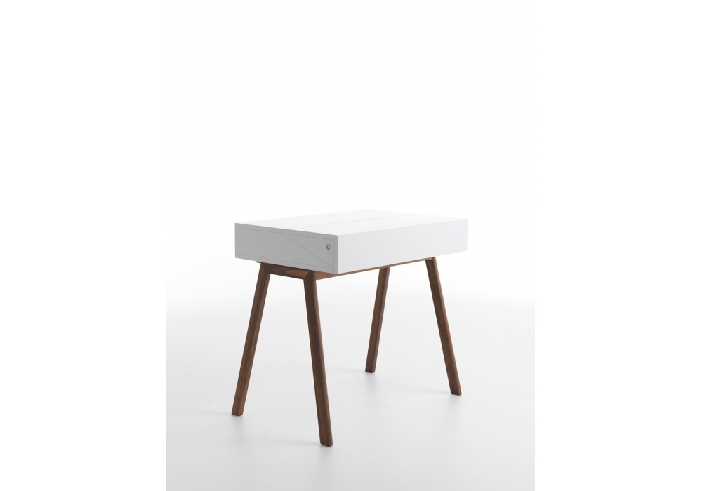 Bureau conçu par Esa Vesmanen pour Casamania & Horm est un bureau réalisé avec caisson et plateau coulissant en MDF laqué mat. Pieds en noyer noir massif. Lumière LED et trou de câble à l'intérieur.