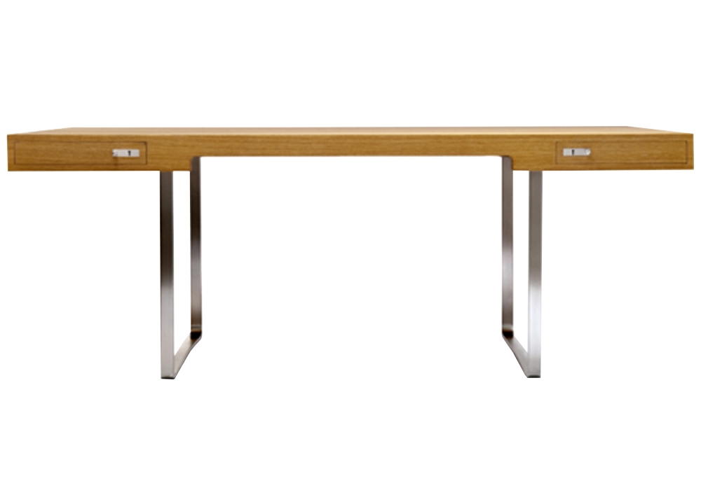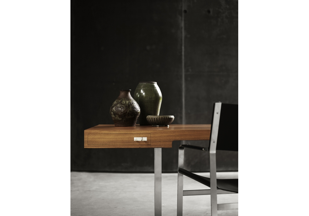 CH110 conçu par Hans J. Wegner pour Carl Hansen & Søn est un bureau avec structure en acier inoxydable et plateau en placage et bois de chêne ou de noyer massif disponible en différentes finitions.
