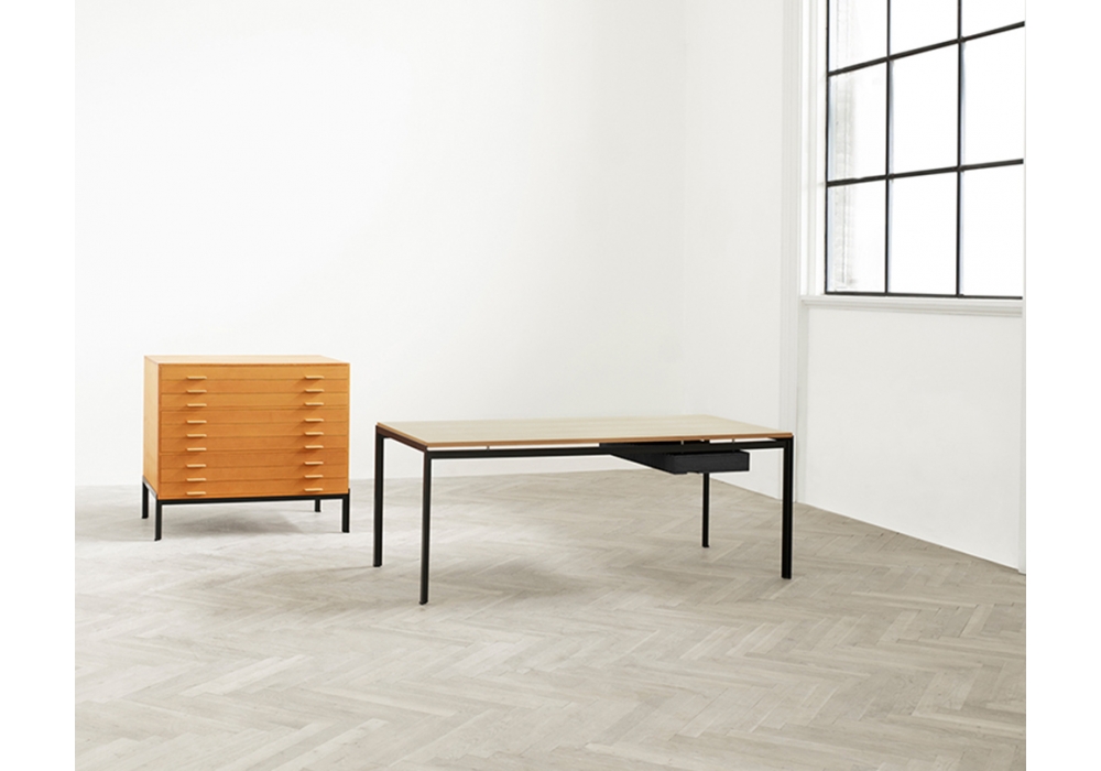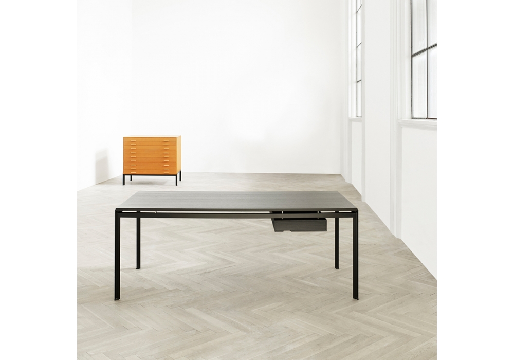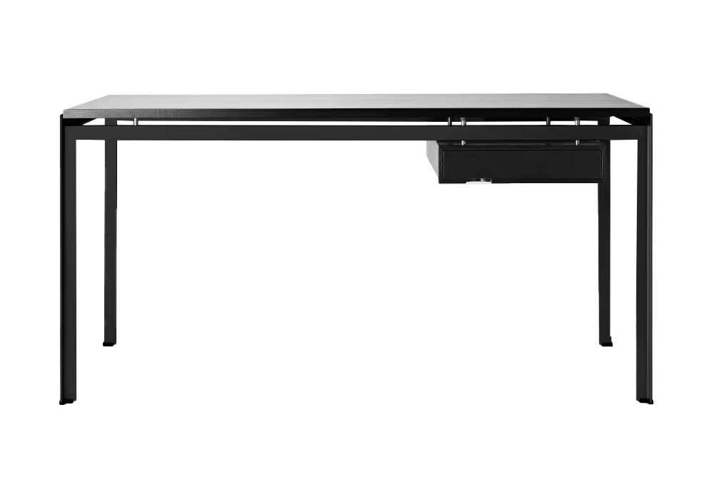 PK52A Student Desk conçu par Poul Kjærholm pour Carl Hansen & Søn est un bureau avec un cadre en acier peint par poudrage noir et un plateau en placage de chêne. Disponible avec ou sans tiroir.