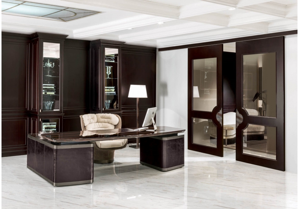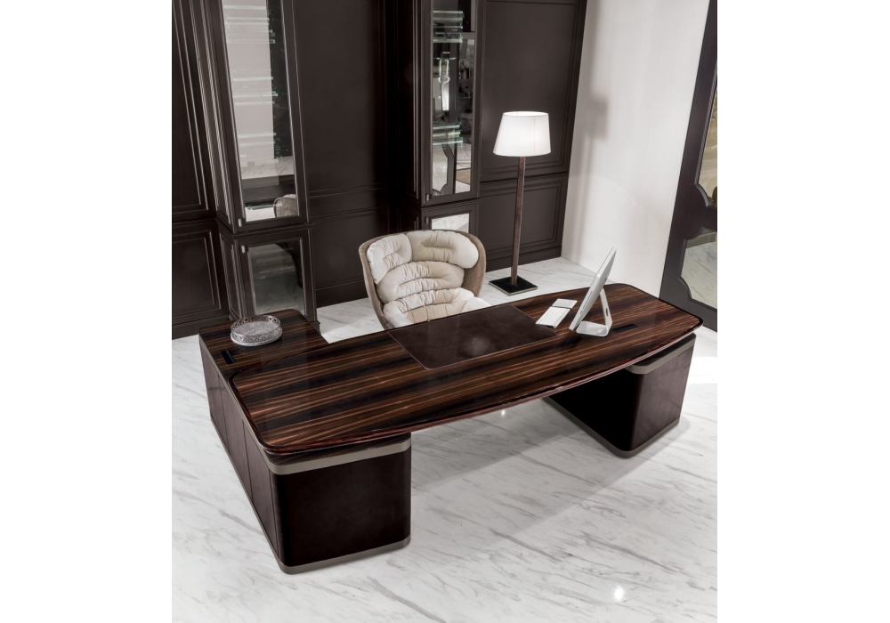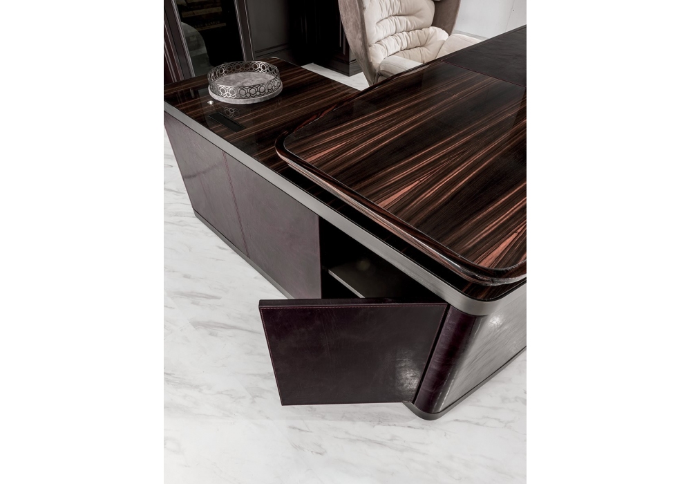 Ector conçu par Elle Studio pour Longhi est un bureau en bois brillant ou mat et bord en bois massif façonné. Dessus avec empiècement en cuir et mini plateau amovible. Base recouverte de cuir avec bords en métal moulu. Disponible dans la version sans péninsule, avec deux commodes placées au bout du plateau ou avec péninsule avec une commode, deux portes et quatre tiroirs.