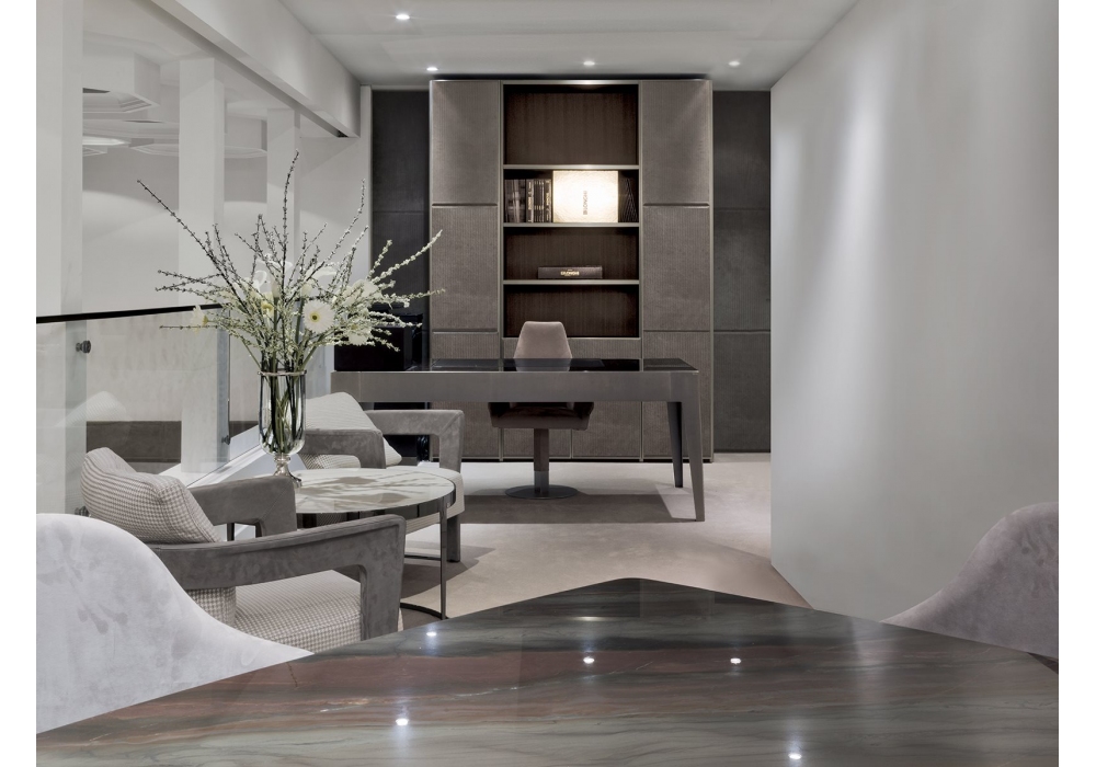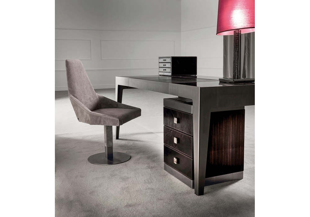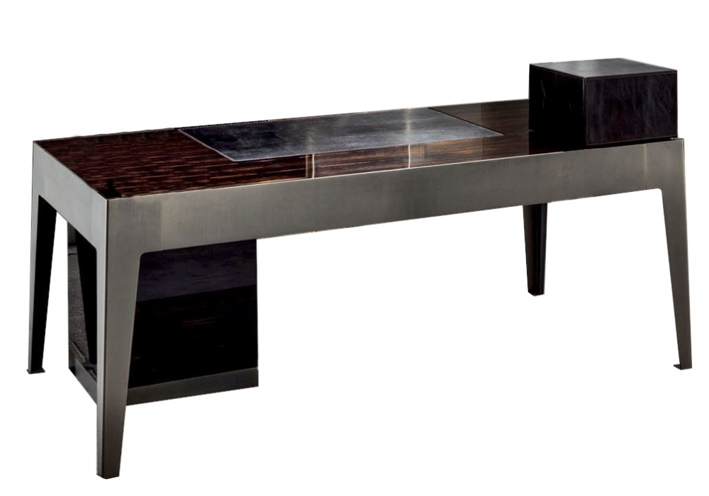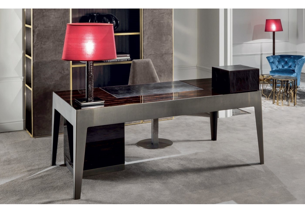 Gorky conçu par Giuseppe Viganò pour Longhi est un bureau avec base en métal au sol avec tiroir, plateau en bois ou laqué brillant avec insert en cuir et mini commode assortie. Commode dans la même finition que le bureau avec tiroirs avant recouverts de cuir. Sur demande, il est également disponible sans blocs-tiroirs.