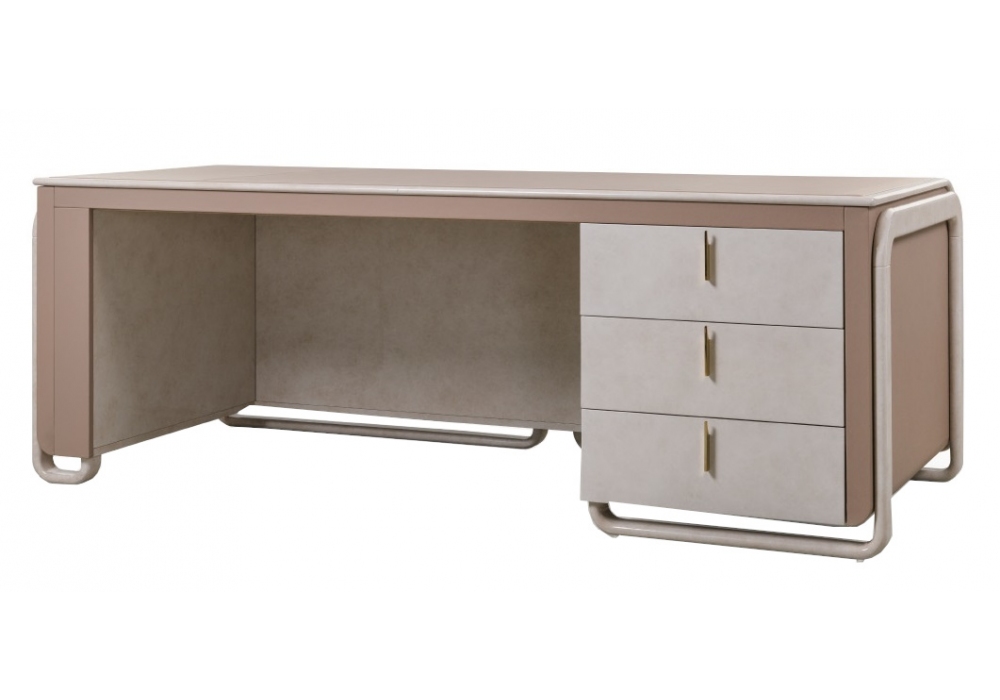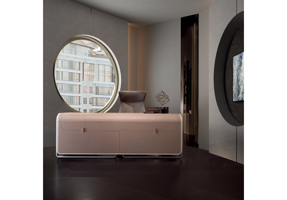 Eclipse conçu par Andrea Bonini pour Turri est un bureau avec structure en MDF, bois massif et panneaux de particules en finition laquée brillante et revêtement en cuir. Détails décoratifs et poignées en métal doré. Il y a trois tiroirs avec doublure en microfibre.