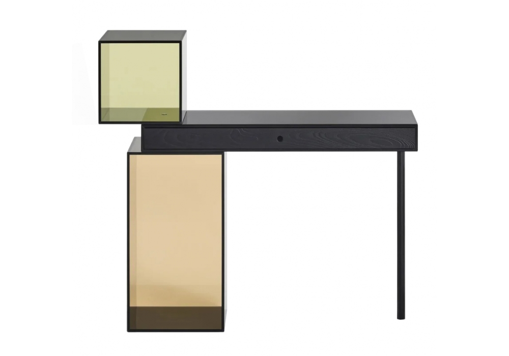 Ratio conçu par Piero Lissoni pour Glas Italia est un bureau caractérisé par des caissons en verre trempé superposés en porte-à-faux et fixés entre eux par des joints métalliques noirs. Le plateau abrite un tiroir en frêne teinté noir. Le cube et le rectangle sont en verre fumé avec un dossier disponible en différentes finitions. Le plateau repose sur un pied cylindrique en frêne massif teinté noir mat.