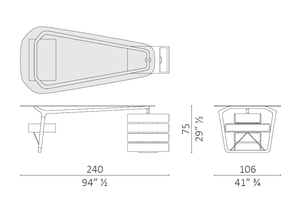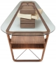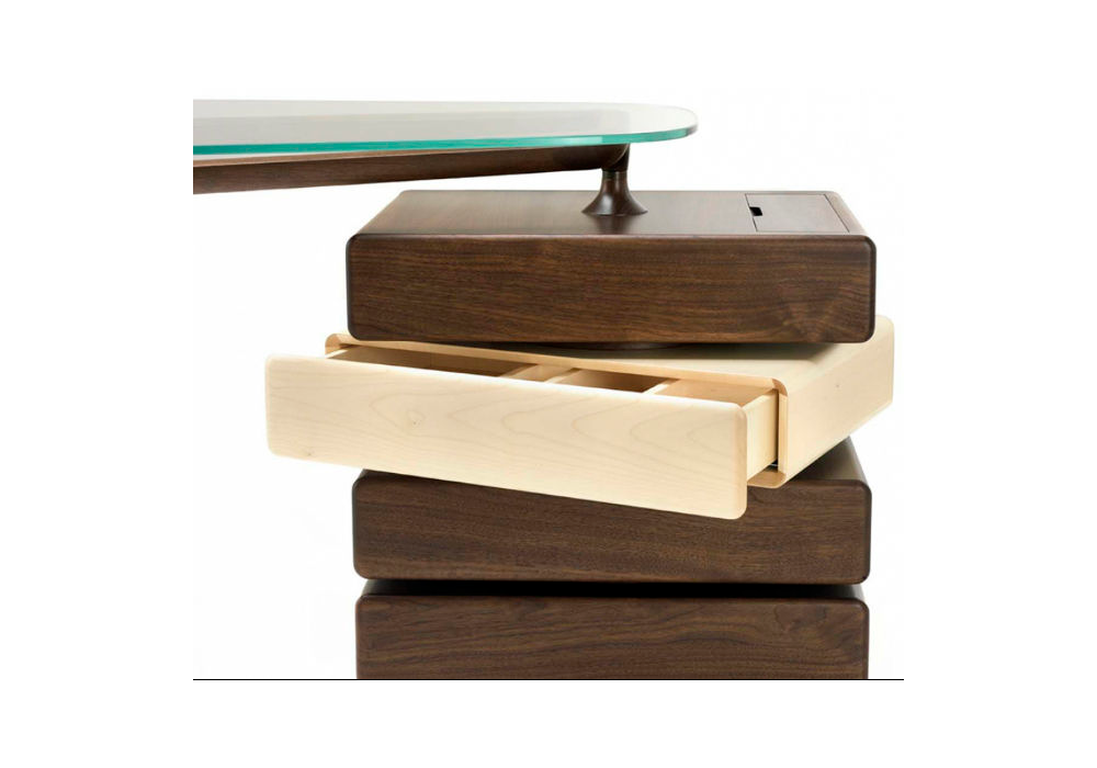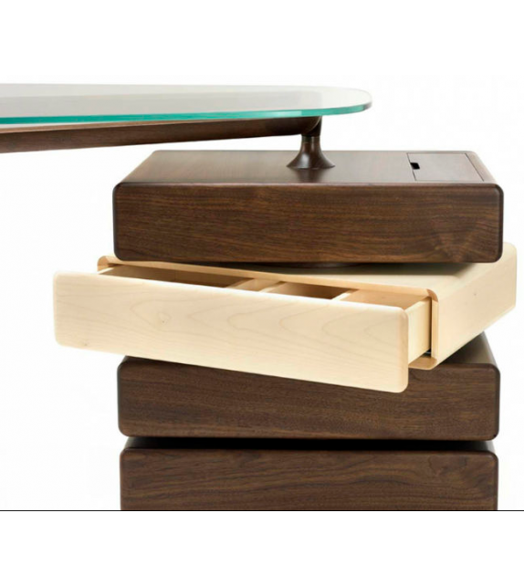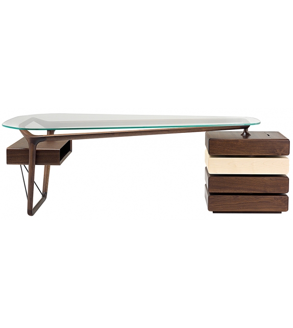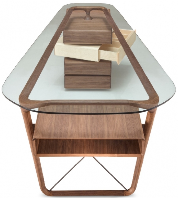 Omaggio by Ceccotti Collezioni is a writing desk made in solid American walnut, chest of drawers made in veneered poplar plywood (3 drawers in American walnut/1 swivel drawer in maple wood), tray in American walnut on RH, 12 mm tempered glass top, ultratransparent or smoked.