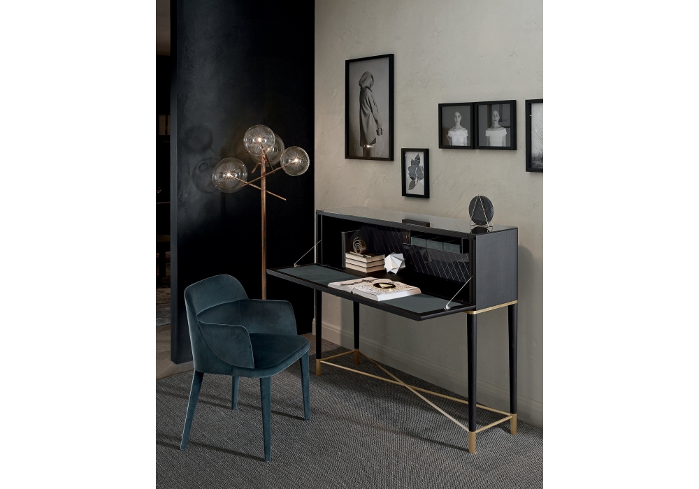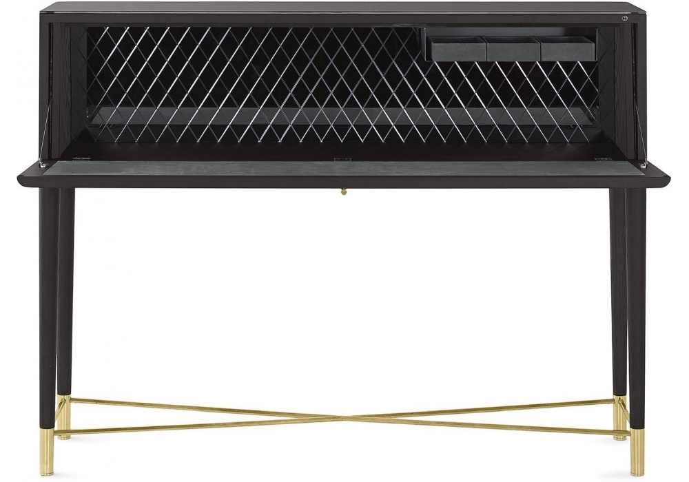 Tama Secrétaire conçu par Carlo Colombo pour Gallotti & Radice est un secrétaire avec porte battante en frêne laqué noir pore ouvert. Partie métalliques laquées laiton satiné. Top et fond intérieur en verre trempé de 6mm d’épaisseur verni réglisse brillant. Fond intérieur avec gravure en forme de losange. Intérieure de la porte battante et boîtes porte-objet recouvertes de suédine Grey 058. Douée de lumière interne LED activé par un senseur à l‘ouverture de la porte.
