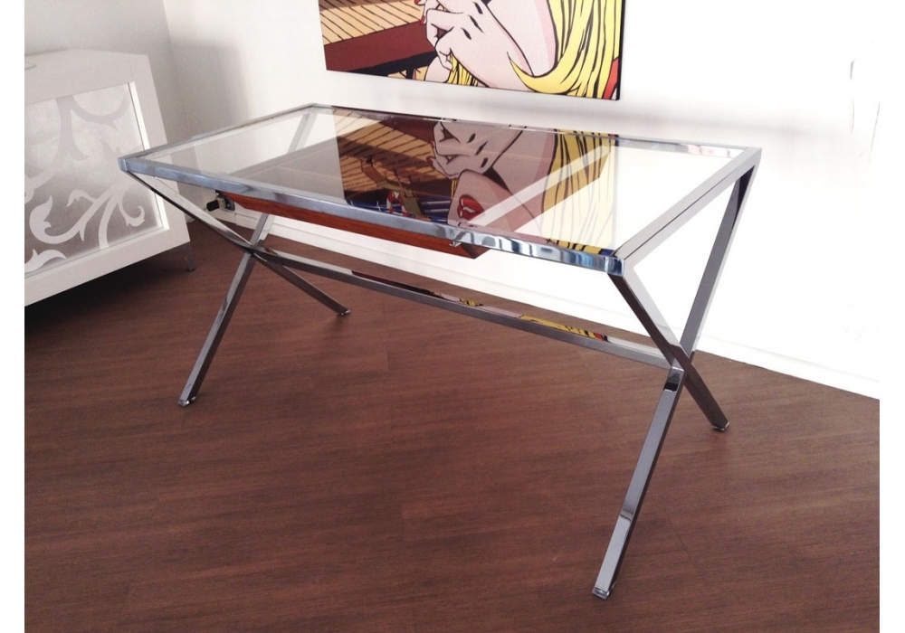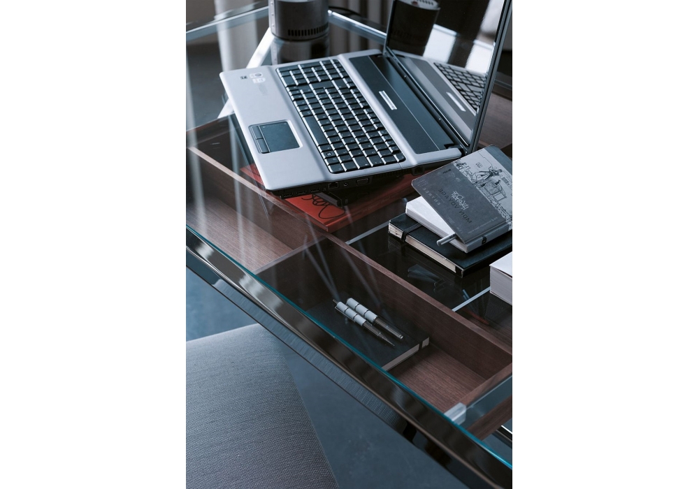 Stylo 140 conçu par T. Colzani pour Porada est un bureau avec structure en métal chromé, plateau en verre extralight temperé et tiroir en bois massif de noyer canaletta disponible en différentes finitions (épaisseur mm. 8).
