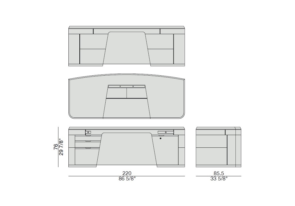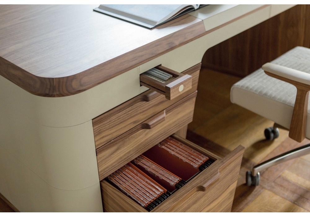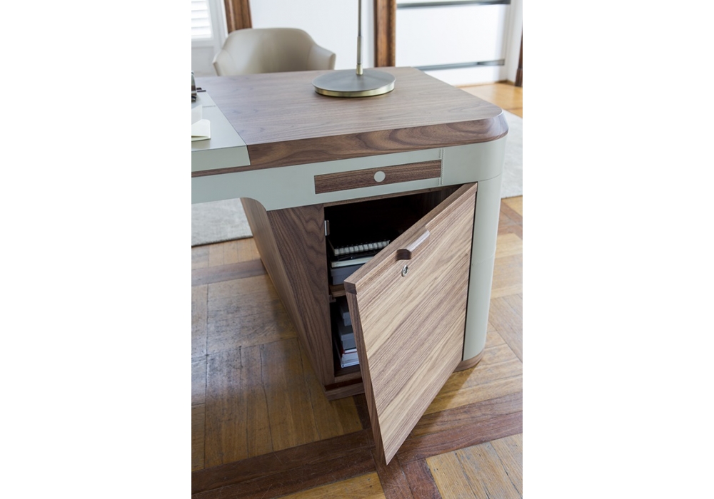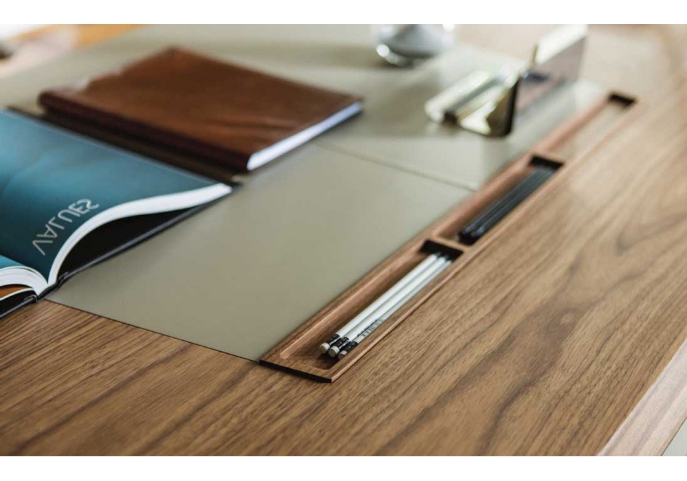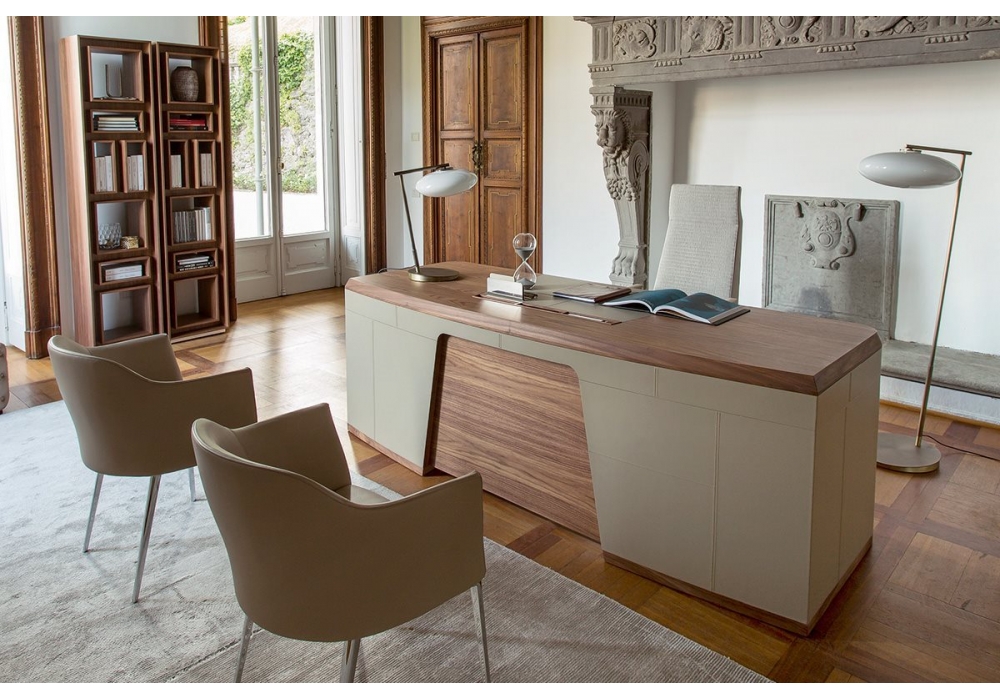 Flavio conçu par U. Asnago pour Porada est un bureau de direction en noyer canaletta avec structure externe revêtue en cuoietto et structure interne en bois. Plateau avec encart en cuoietto avec coutures à vue. Videpoches sur le plateau, avec des différents compartiments pour petits objets. Équipé sur le côté droit avec petit plateau avec charnière automatique, porte avec serrure et étagère interne en bois. Avec petit tiroir avec charnière automatique pour crayons, deux tiroirs et un tiroir profond pour les dossiers avec fermeture douce sur le côté gauche. Poignées en bois.