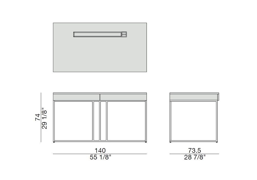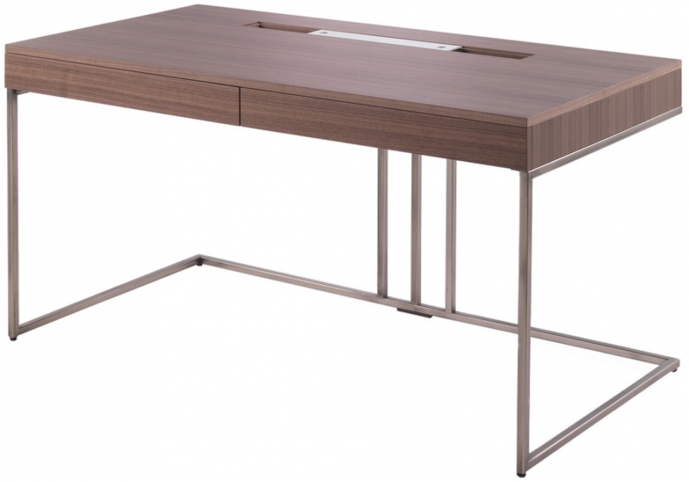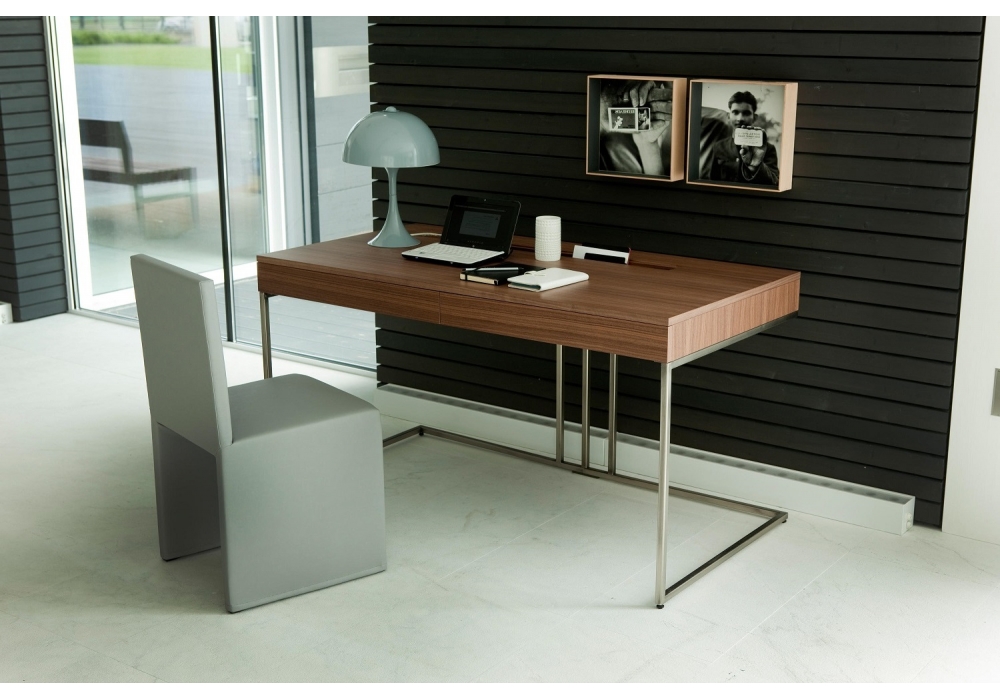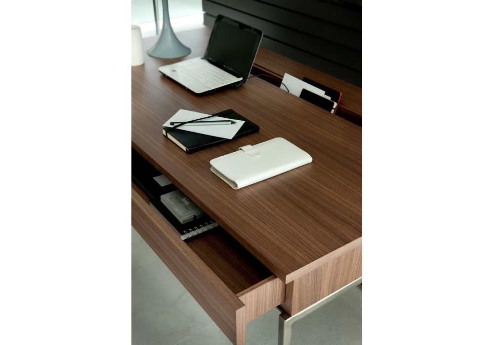 Kepler conçu par G. Azzarello pour Porada est un bureau réalisé en bois de noyer canaletta disponible en différentes finitions avec deux tiroirs, vide-poches, avec trou pour les câbles et structure en métal.