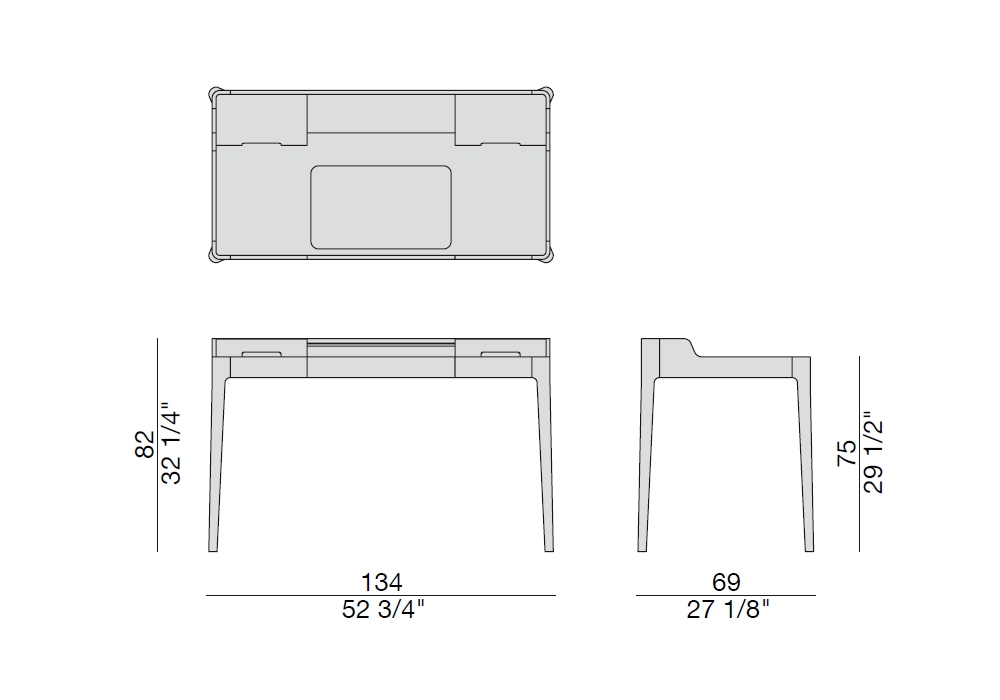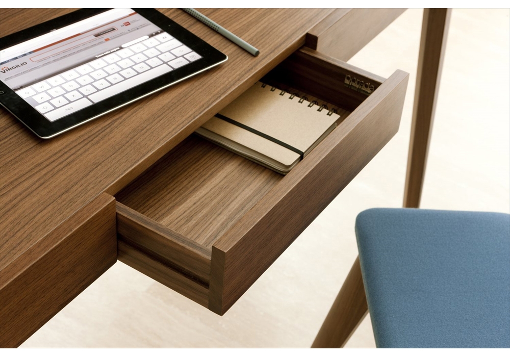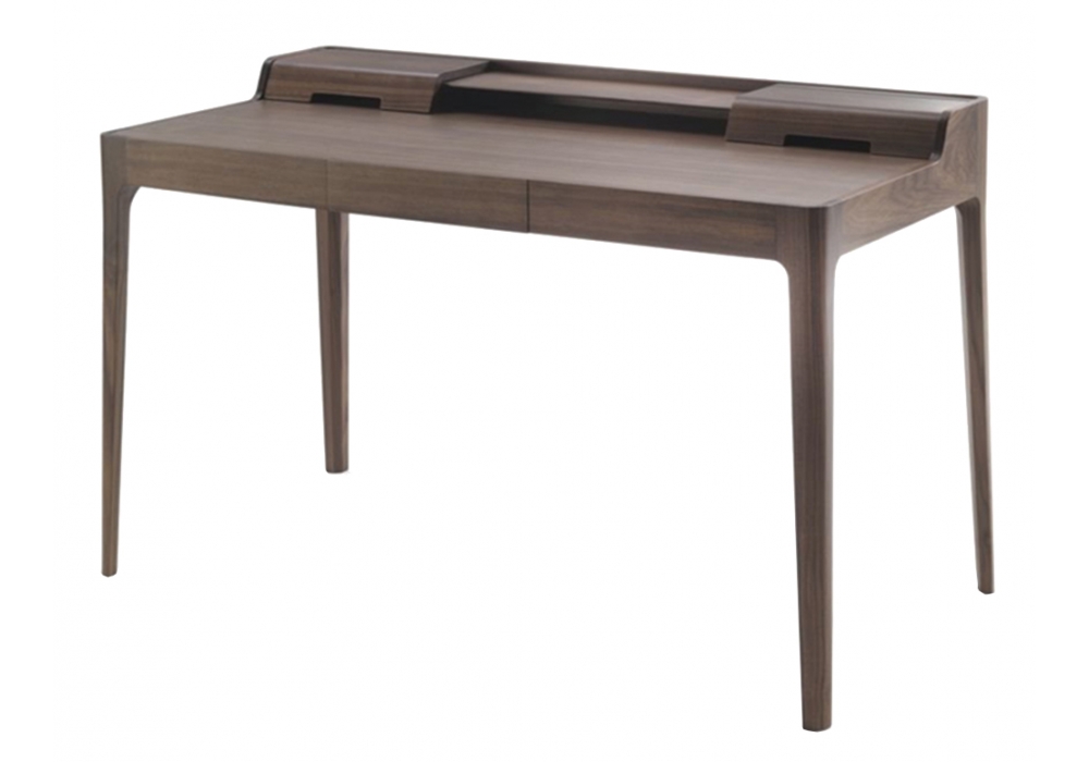 Saffo conçu par Carlo Ballabio pour Porada est un bureau avec tiroir en noyer canaletta massif avec videpoches et trou passe-câbles cachés. Sous-main en cuoietto disponible en différentes finitions.