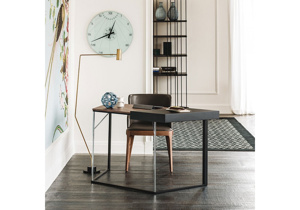 Clarion conçu par Andrea Lucatello pour Cattelan Italia est un bureau avec structure en acier gaufré noir ou graphite et partiellement en acier chromé. Une partie du plateau est réalisée en MDF laqué en la même finition que la structure et une partie en noyer Canaletto ou chêne brûlé.