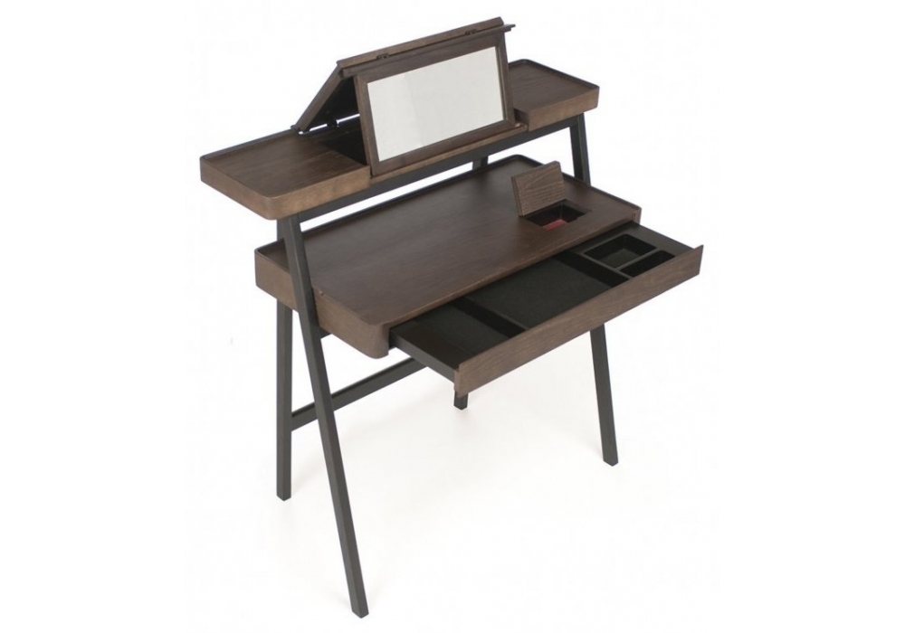 Tray conçu par Neri & Hu pour De La Espada est un bureau en bois disponible en différentes finitions. Tray fonctionne aussi comme une coiffeuse grâce au miroir caché dans le dessus de le bureau.