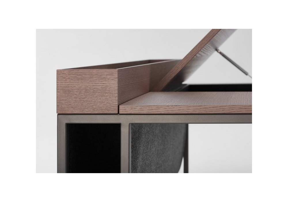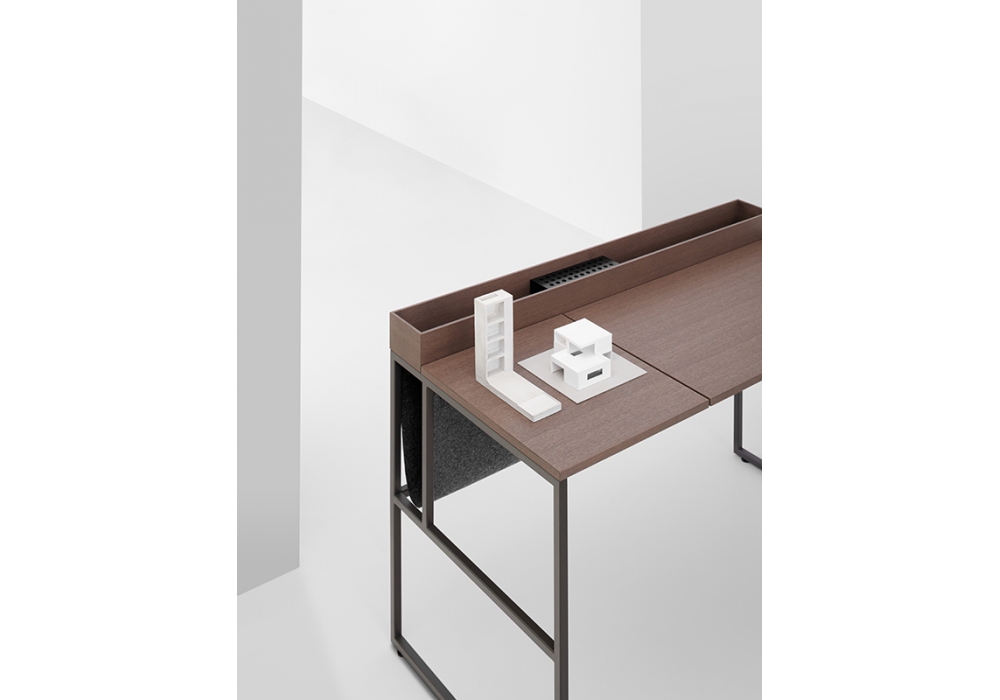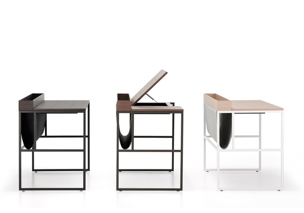 20.Venti Home conçu par 967ARCH pour MDF Italia est un bureau avec structure en acier thermolaqué en différentes finitions, le plateau en chêne blanchi, clair ou anthracite. Le bureau dispose d'un tiroir de rangement avec ouverture à rabat et d'un sac en tissu, mélange divin, comme porte-objet ou magazine.