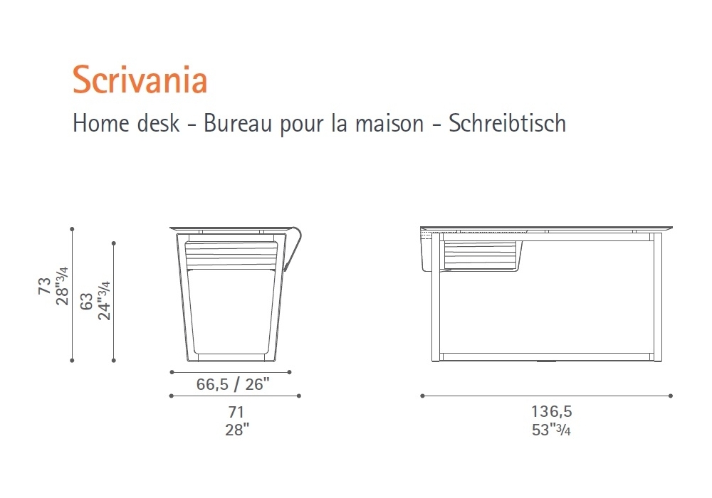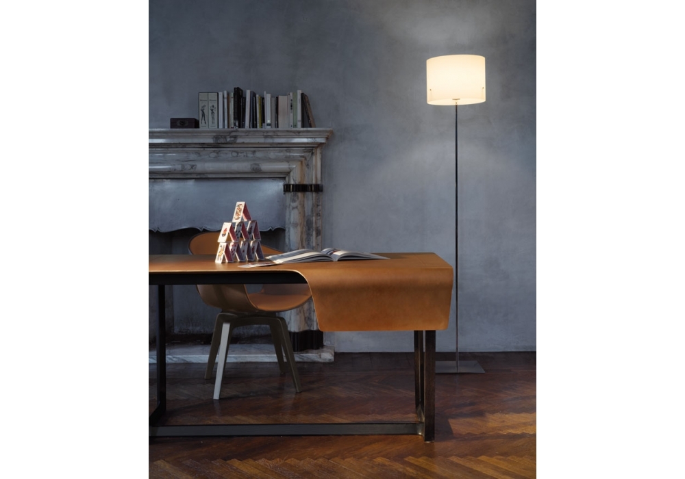 Fred Poltrona Frau: Le compagnon idéal de Fred est le fauteuil Ginger, conçu pour rendre encore plus complète et harmonieuse la zone bureau de la maison. Le bureau de maison pour un espace à se consacrer personnellement, intime et élégant. Le revêtement du plan de travail, en panneau de fibre de bois de densité moyenne, laqué avec une couleur anti-griffe de couleur noire, est réalisé en Cuir Saddle Extra. Le travail particulier permet d’utiliser un revêtement unique, sans la moindre couture. Pour renforcer la sensation d’homogénéité, le bord à coupe nette est fini avec une teinture et une cire de protection. Un procédé artisanal spécial permet d’obtenir la courbure frontale du cuir que soient nécessaires des supports internes. Sur la surface, de délicates incisions et des marquages à froid, faits main, créent de délicates décorations graphiques. La structure de Fred est en bois massif de frêne teinté wengé avec profil à section triangulaire.Même matériau pour le tiroir qui complète le bureau, monté sur des glissières métalliques à fermeture amortie. Le bord du devant est arrondi à 45° pour faciliter l’ouverture. Le revêtement en Cuir Saddle Extra est disponible dans les versions tête de maure et camel. Accessoires en métal avec traitement galvanique gris métal, et peinture de protection.