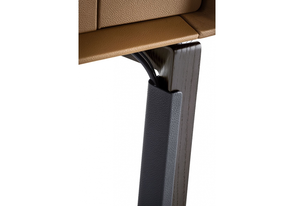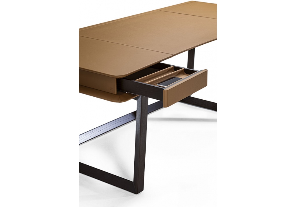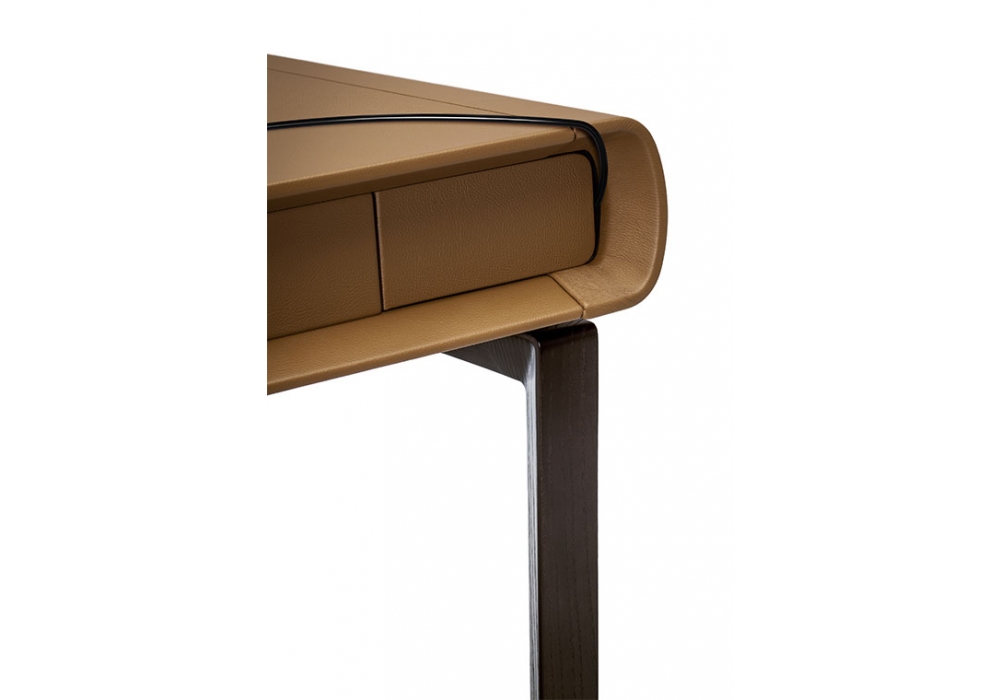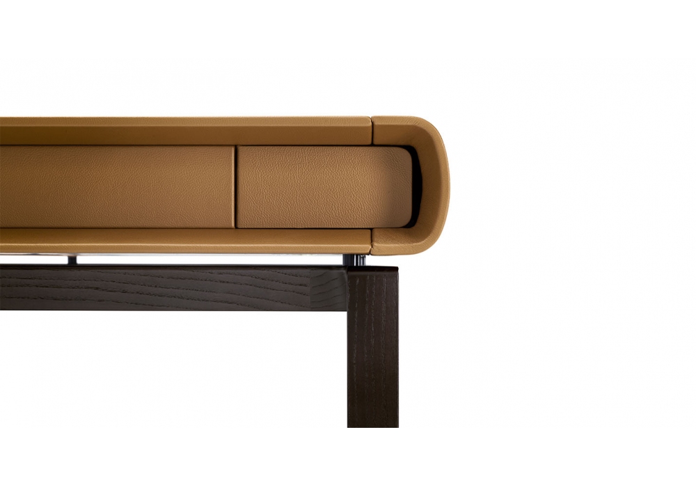 Peek-a-Book conçu par Roberto Lazzeroni pour Poltrona Frau est un bureau avec structure de support en frêne massif teinté et le dessus formé et fabriqué avec des panneaux de contreplaqué de peuplier contre-veener avec MDF. Le dessus, l'avant et les côtés des tiroirs et des portes d'accès aux compartiments arrière sont revêtus de Pelle Frau®. Le bureau a deux tiroirs avant et deux compartiments derrière les tiroirs qui sont accessibles depuis des portes sur le côté. Les compartiments sont conçus pour servir de conduit pour les câbles et peuvent être utilisés pour loger des prises multiples ou électriques. La structure interne des tiroirs est également en frêne massif teinté wengé. Le devant est en MDF recouvert de cuir Pelle Frau®.