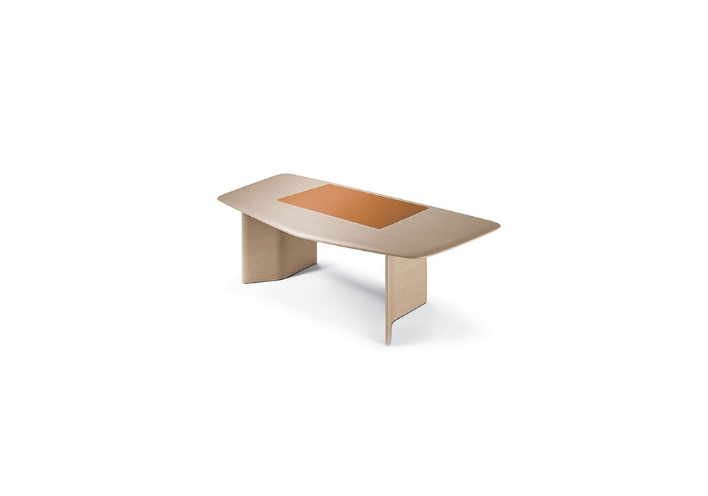 Version standard: Plateau en fibre de bois de densité moyenne plaqué en chêne TW ou revêtu de cuir Pelle Frau. Pieds en MDF et disponibles plaqués en chêne TW uo recouverts de cuir ou de cuir de selle. Cette version est également disponible avec passe-câble pour panneau de fond comme accessoire.