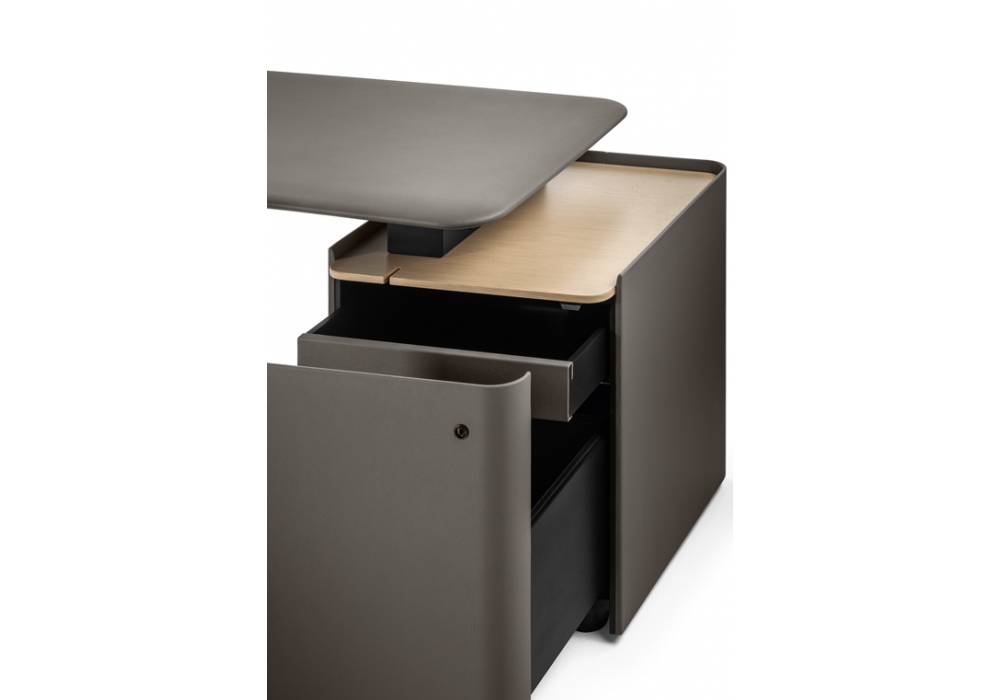 Petite version: Plateau recouvert de cuir Pelle Frau ou cuir de selle. Pieds en chêne TW plaqué ou rembourrés en cuir Pelle Frau ou cuir de selle. Cette version est équipée d'un système de gestion des câbles et est disponible avec ou sans coffre à tiroirs.