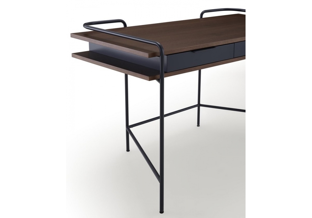 Alando conçu par Eric Jourdan pour Ligne Roset est un bureau du dynamisme subtil dérivant du contraste entre la structure tubulaire en métal et le noyer foncé du plateau.