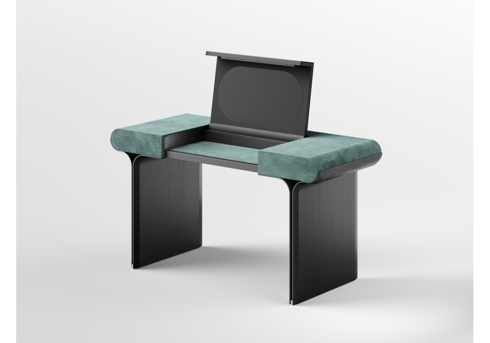 Stami conçu par Studiopepe pour Gallotti&Radice est un bureau et coiffeuse avec base en frêne courbé teinté noir pore ouvert et détails en laiton brillant. Structure en bois avec revêtement en cuir ou suédine dans les coloris de nos échantillons. Plateau rabattable en bois teinté noir à pores ouverts et compartiment intérieur équipé d’un sous-main en cuir ou suédine coordonné au revêtement extérieur. Plateau rabattable avec tableau magnétique (bureau) ou miroir (coiffeuse). Disponible aussi version avec tiroirs latéraux.