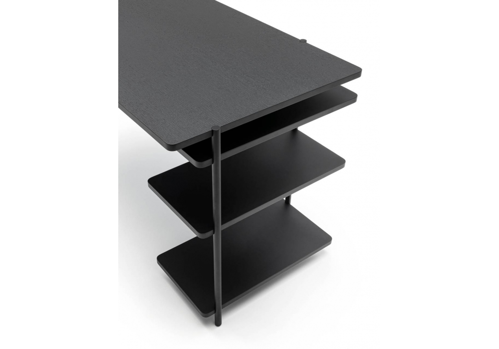 Aero D conçu par Shibuleru pour Living Divani est un bureau avec plateau supérieur, plaqué en essence de châtaignier teinté naturel ou charbon, Stone Oak® ou en placage de bois multilaminé Striped Grey avec finition acrylique. Le plateau inférieur et les étagères sont toujours peints en noir mat.