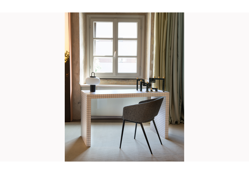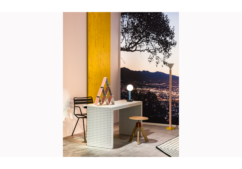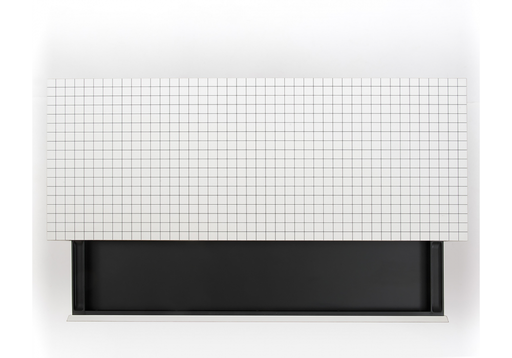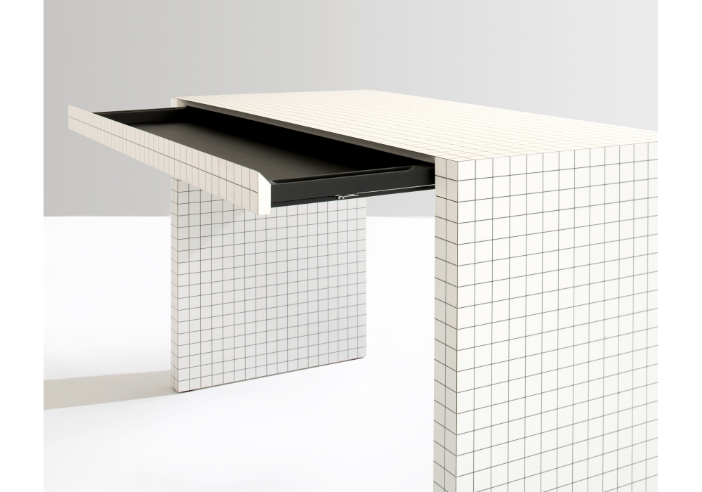 2750 Quaderna conçu par Superstudio / Cristiano Toraldo di Francia pour Zanotta est un bureau réalisé avec une structure en bois lamellé alvéolaire imprimé, de couleur blanche, avec une impression numérique à carreaux. Tiroir coulissant escamotable creusé dans l'épaisseur du plateau, caisson tiroir en bois peint noir gaufré anti-rayures.