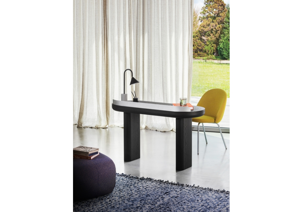 Jumbo conçu par Paolo Cappello pour Miniforms est un bureau avec plateau et pieds en frêne, bande de métal en or rose mat, galvanisé ou laqué, disponible en différentes finitions.