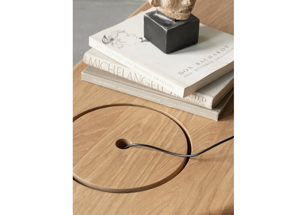 The Eclipse conçu par Fred Rigby Studio pour Audo Copenhagen est un bureau en chêne, disponible en différentes finitions et une colonne en acier noir qui sert également de conteneur.