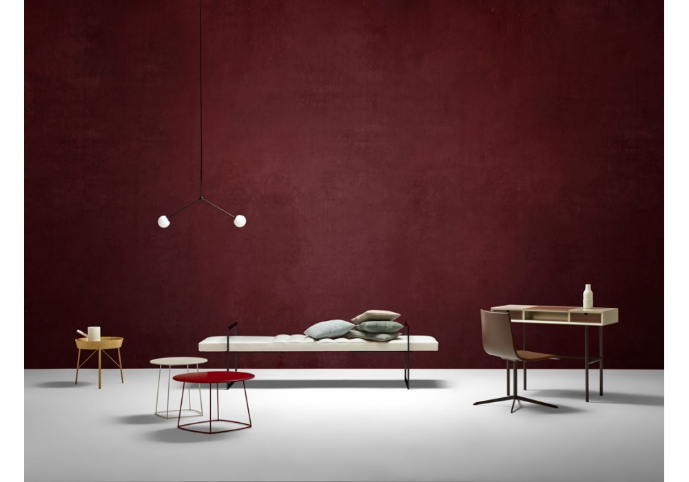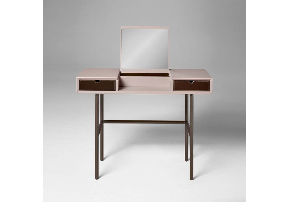 Chapeau conçu par Radice Orlandini pour My Home Collection est un bureau avec base en acier tubulaire laqué. Le plateau est en fibre de bois laqué mat enrichi d'inserts en cuir tandis que sur les côtés se trouvent deux tiroirs et un compartiment central ouvert. La coiffeuse est équipée d'un miroir à rabat avec une zone porte-objets dans la partie inférieure, également recouverte de cuir.