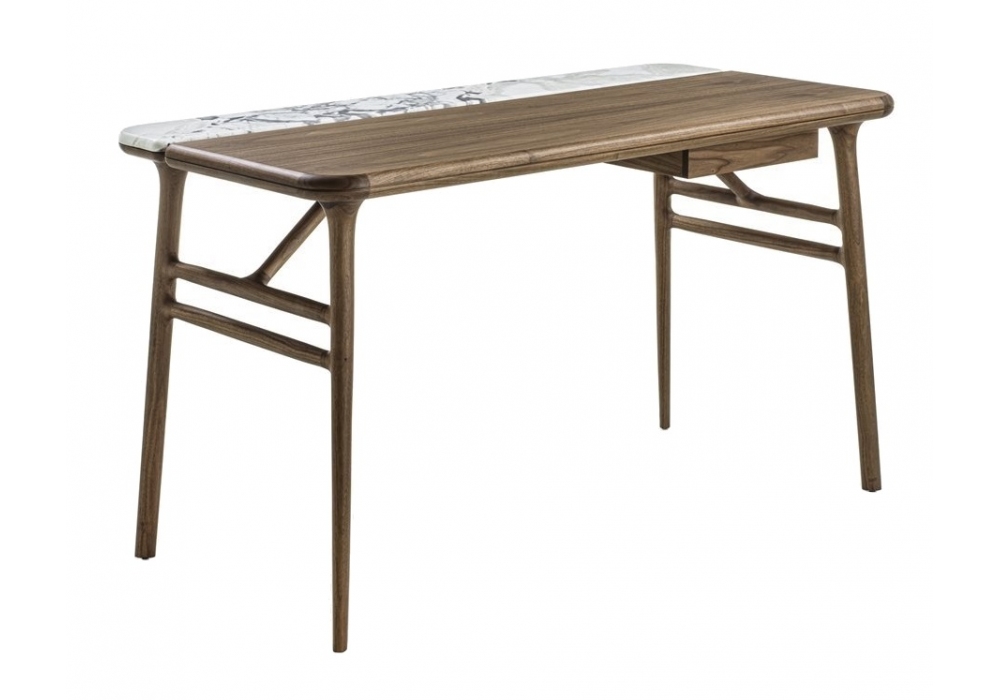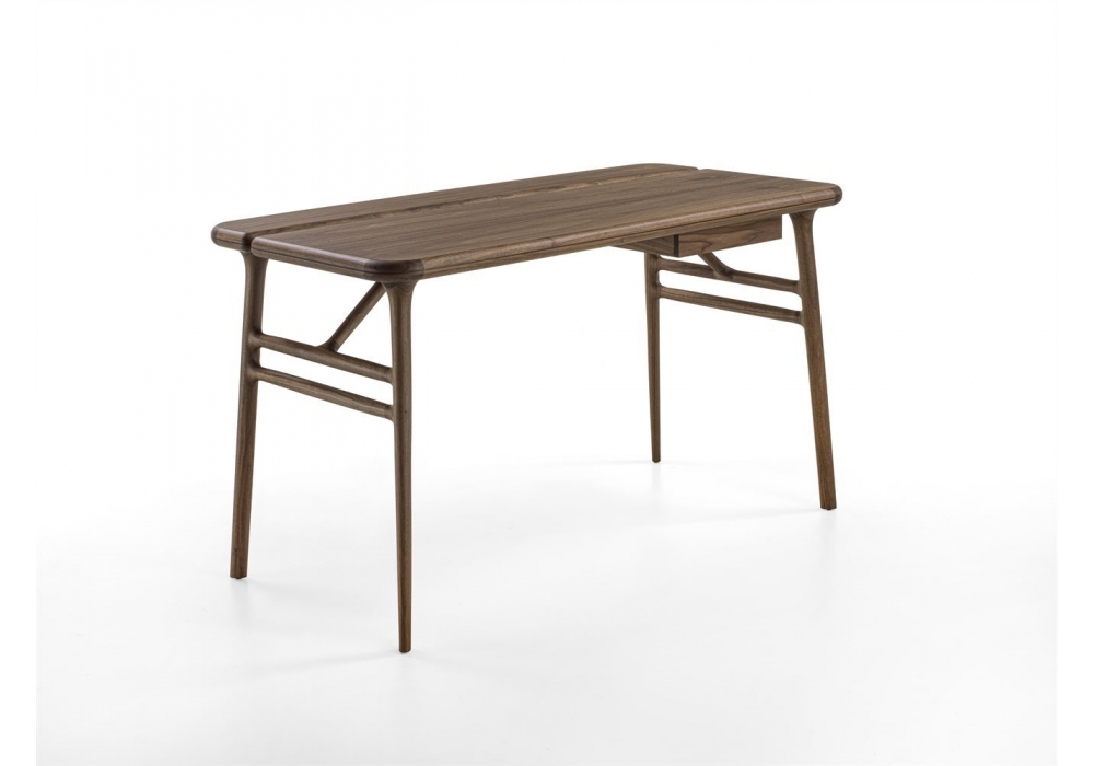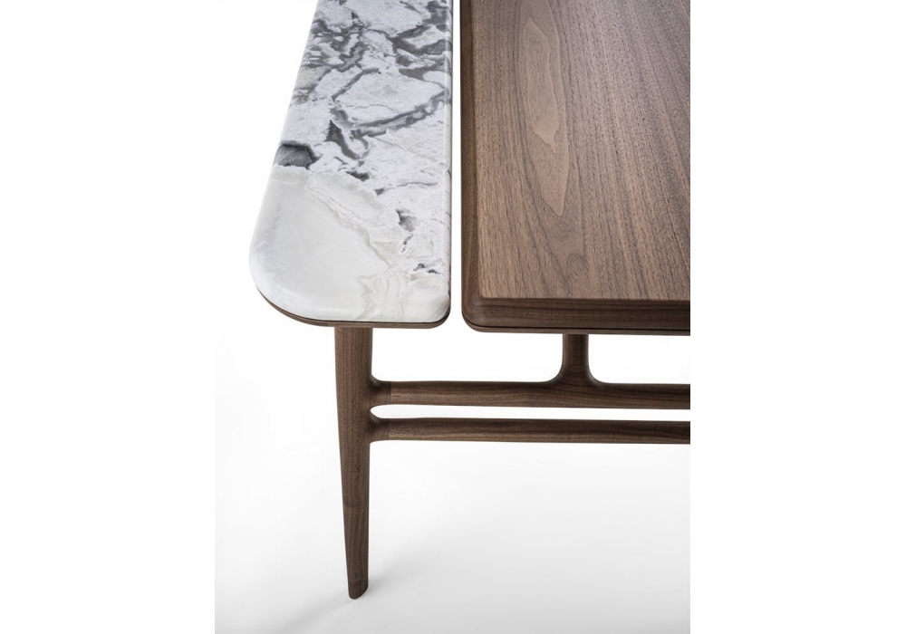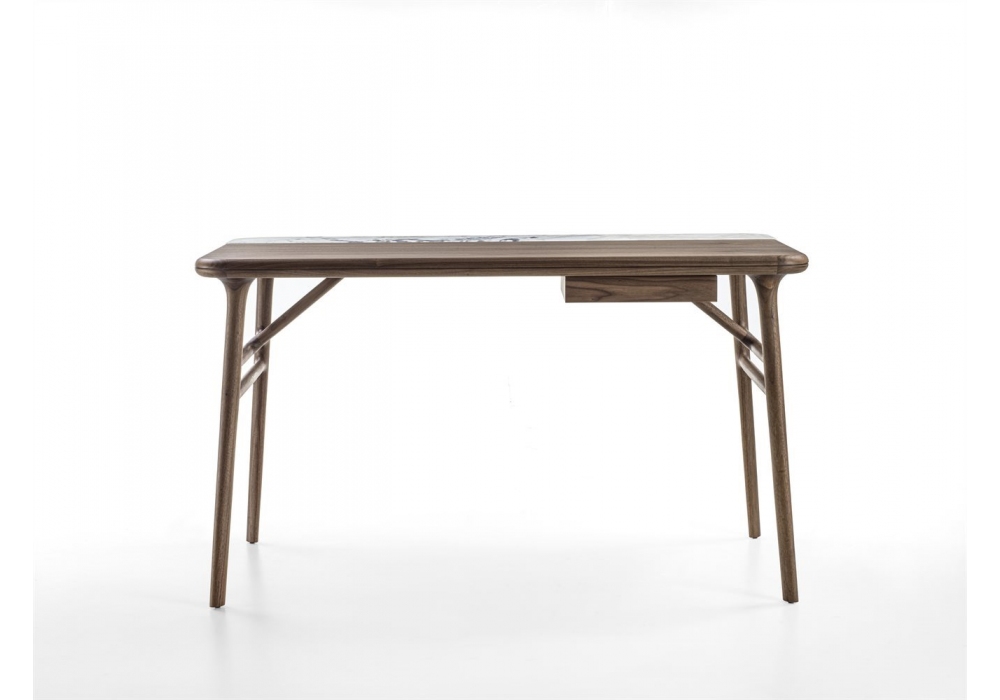 Aksel conçu par Meneghello Paolelli pour Porada est un bureau en noyer canaletta avec un tiroir qui peut être positionné à droite ou à gauche. Le plateau est divisé en deux parties clairement séparées par un espace : plateau principal en noyer Canaletta avec chant en bois massif et bande arrière en noyer Canaletta, en marbre ou recouvert de cuir Plus. Possibilité d'insérer un porte-crayon dans l'interstice entre les plateaux ovales et un plateau rond en finition laque Bronzoro.