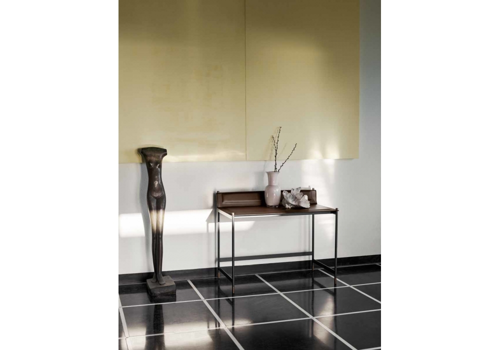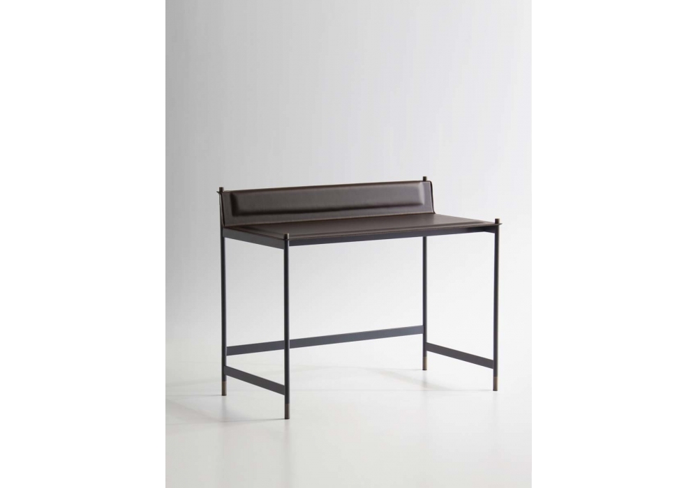 Terrazzo conçu par Nicola Bonriposi pour Potocco est un bureau avec structure en tube d'acier peint par poudrage en finition gaufrée anthracite avec détails de pieds et détails de fixation du plateau cylindrique en finition laiton bruni. Dessus avec insert de rembourrage souple en mousse de polyuréthane, recouvert de cuir et fini avec des coutures périmétriques visibles.