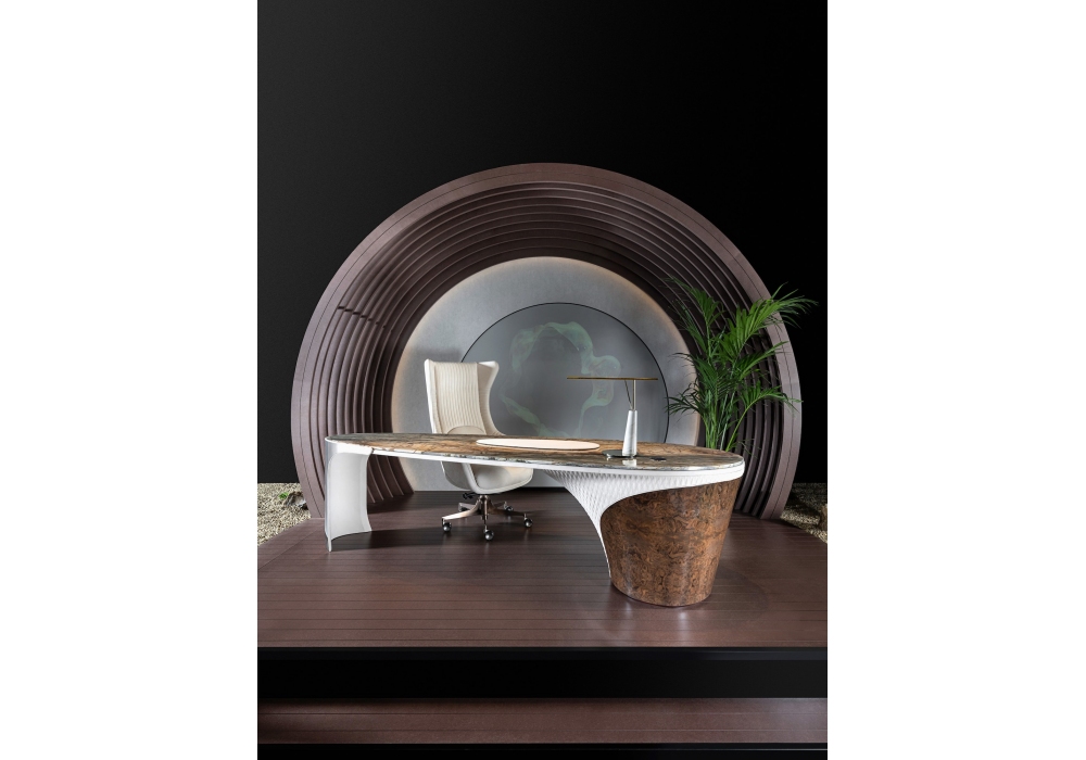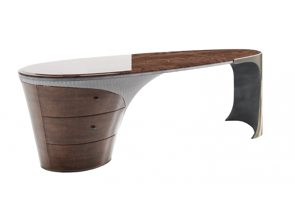 Jet Plane Radica conçu par Steve Leug pour Visionnaire est un bureau avec plateau ovale en noyer ou en marbre. La structure principale est en bruyère de noyer façonnée recouverte de cuir, alternant des sections lisses et matelassées en losange. Le bureau est équipé de deux tiroirs avec des intérieurs peints avec des laques mates et des poignées en laiton recouvertes de cuir. Le pied de support est en bois façonné avec un intérieur recouvert de cuir et une partie externe en acier inoxydable courbé avec finition satinée. Jet Plane Radica est disponible en différentes finitions.