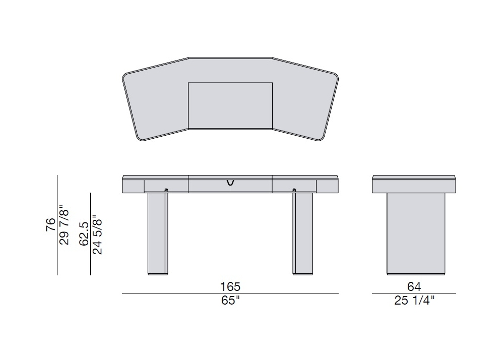 Moty conçu par Umberto Asnago pour Porada est un bureau avec des pieds recouverts de cuir Cuoietto comme le dos du plateau, les façades des tiroirs, l'abattant et le fond du compartiment de rangement. La partie en bois est en noyer canaletta. Détails en métal bronze.