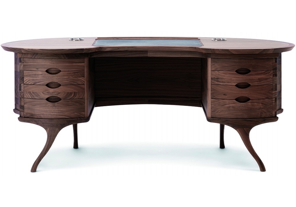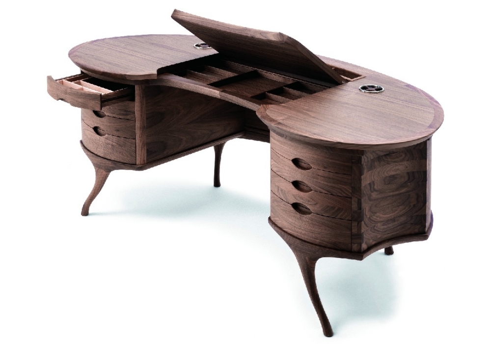 Bean by Ceccotti Collezioni is a writing desk is manufactured in solid American cherry-wood or American walnut. Bean reminds desks French of the eighteenth century with its soft shape that looks like a big bean. The seat fits perfectly into the notch underneath floor. Drawers rounded, thin legs like a secretaire and well hidden, complete the solid composition of the refined desk. A formal object of great value and quality construction.