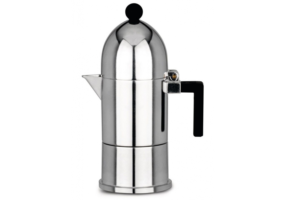 La Cupola conçue par Aldo Rossi pour Alessi est une cafetière espresso en fonte d'aluminium. Poignée et pommeau en résine thermoplastique, noir. Disponible en 3 ou 6 tasses.