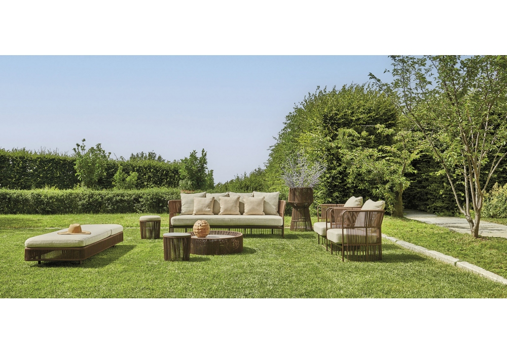 Tibidabo conçu par Calvi & Brambilla pour Varaschin est un canapé avec structure en aluminium enduit de poudre avec revêtement en fibres synthétiques tissées. Pieds en polypropylène. Coussins amovibles. Disponible en différentes finitions et en deux tailles.