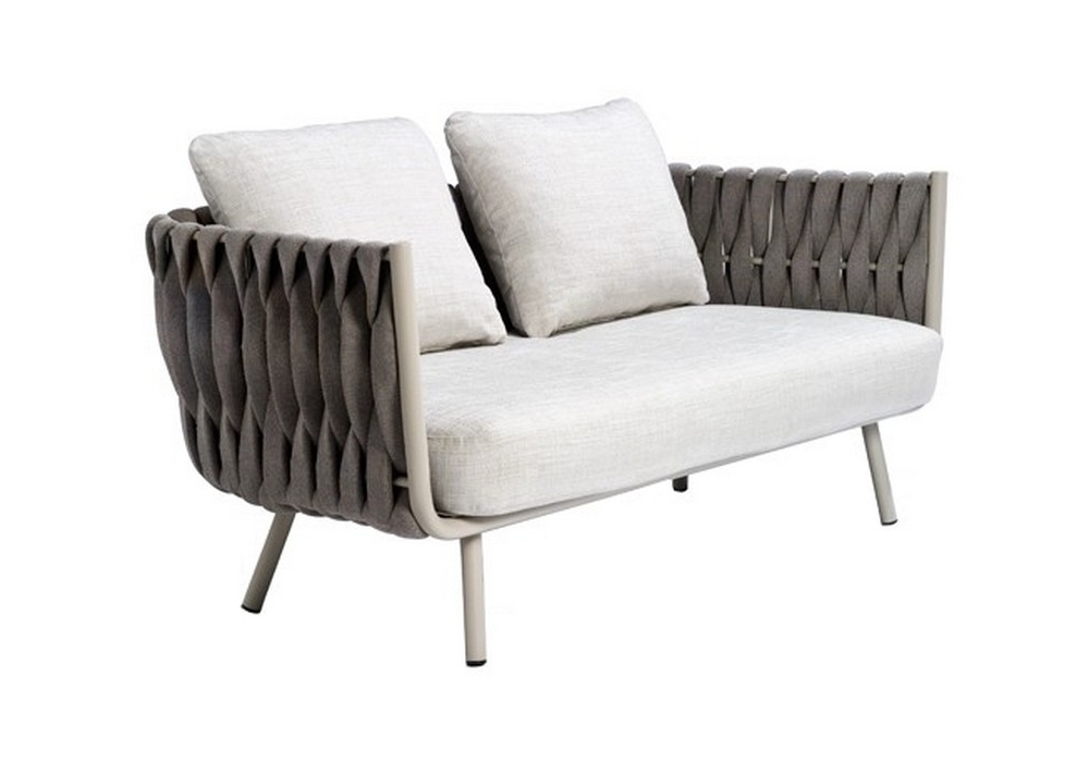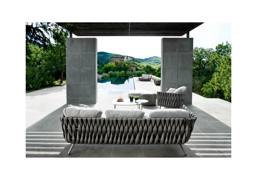 Tosca conçu par Monica Armani pour Tribù est un canapé avec corps en acier inoxydable enduit de poudre et recouvert d'un tissage vertical extra-large, en textilène et polyoléfine. Les coussins de dossier et d'assise sont rembourrés et disponibles avec différents revêtements.
