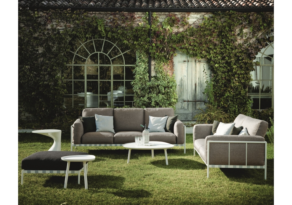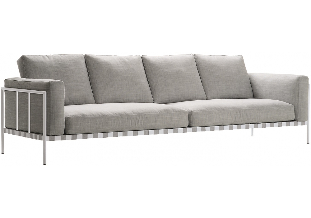 1034 Parco conçu par Emaf Progetti pour Zanotta est un canapé d'extérieur avec structure en acier peint en blanc ou noir. Tous les coussins sont en polyéther/paineira à cellules ouvertes réticulé, fibre végétale hydrofuge. Revêtement en tissu Talasso. Disponible en différentes dimensions.