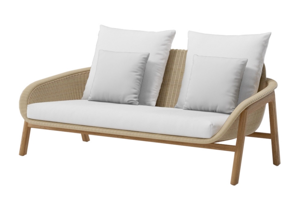 Vimini conçu par Patricia Urquiola pour Kettal est un canapé avec une structure en bois de teck et un corps entièrement recouvert de tressage en osier. Les coussins sont rembourrés et recouverts de tissu adapté à une utilisation en extérieur. Vimini est disponible en différentes versions et finitions de tissu.