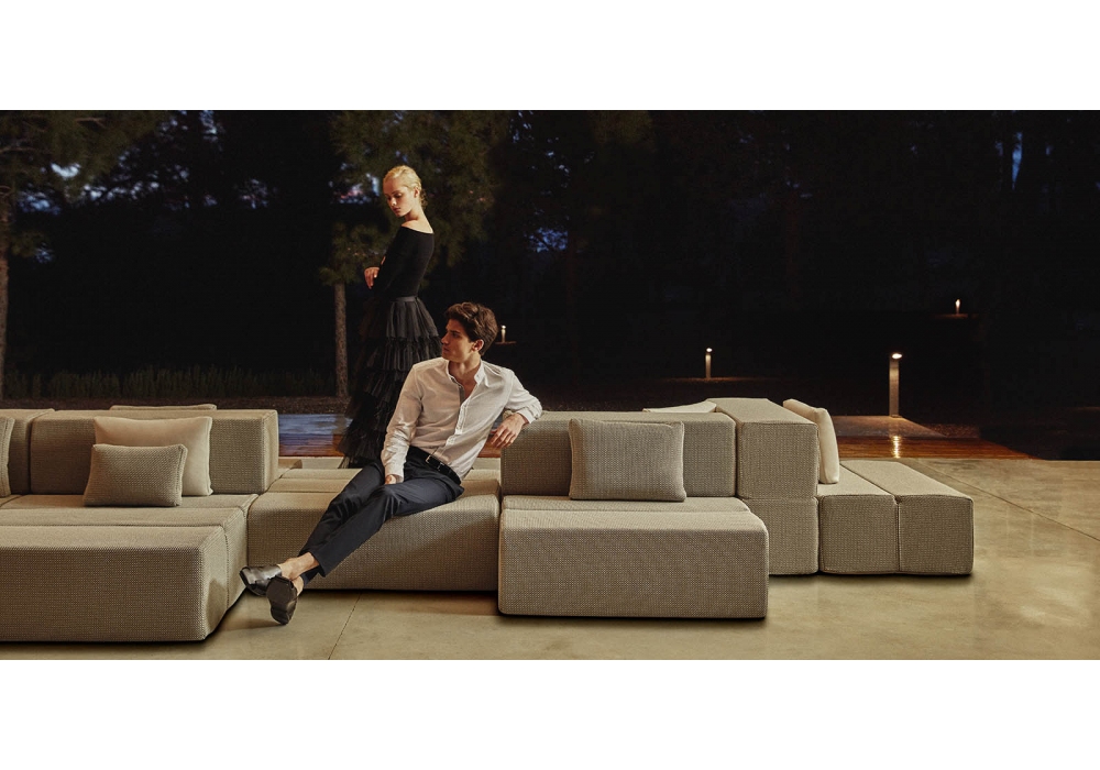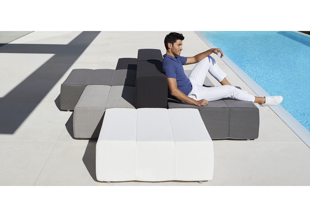 Tablet conçu par Ramón Esteve pour Vondom est un canapé modulable avec structure métallique et pieds en aluminium poudré. Tapisserie en tissu d'extérieur (100% polypropylène) disponible en différentes finitions. Traitement hydrofuge.