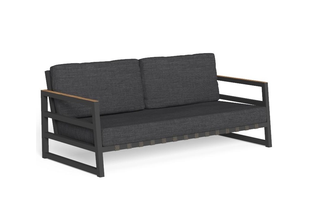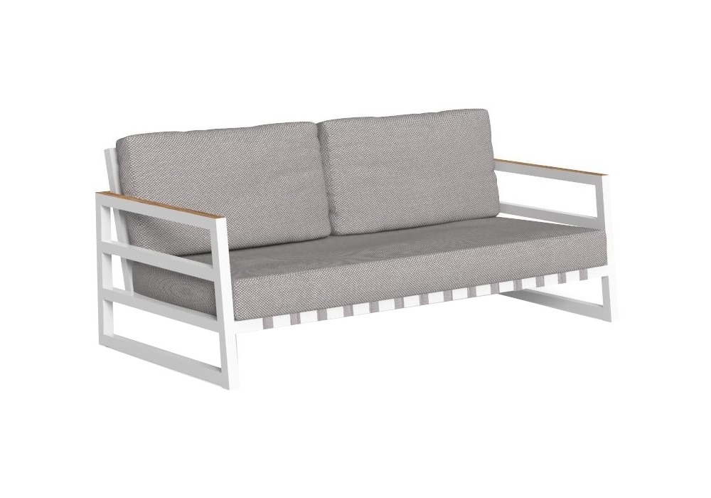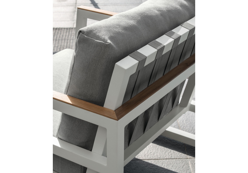 Alabama Alu est un canapé par Marco Acerbis pour Talenti. Structure en aluminium thermolaqué, disponible en deux couleurs: blanc et graphite. L'assise et le dossier ont un support de sangles élastiques synthétiques, avec une bande de teck sur la face supérieure. Tissu disponible en gris pour les versions blanc et gris foncé pour la version graphite. Les coussins sont en tissu, amovible, facile à laver et résistant aux agents atmosphériques.