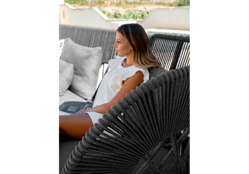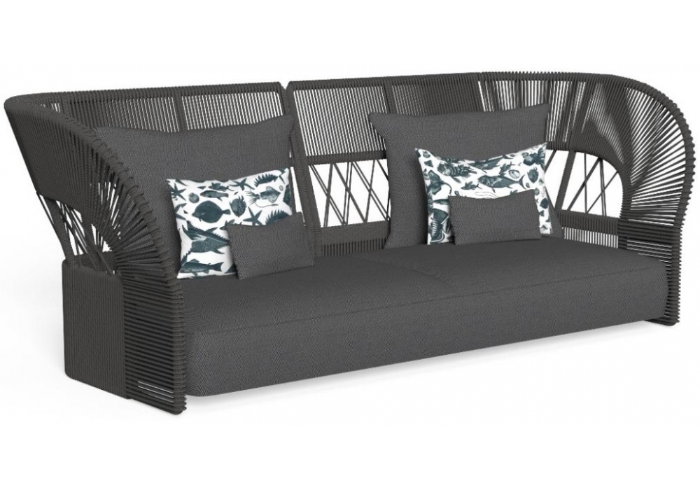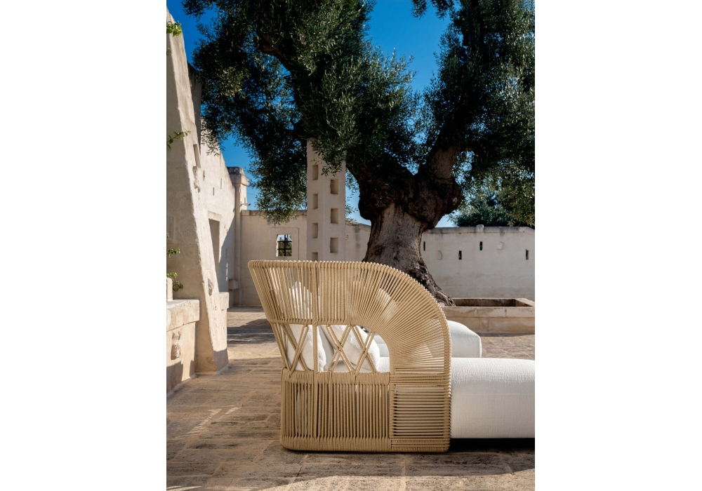 Cliff Dèco conçu par Ludovica et Roberto Palomba pour Talenti est un canapé avec dossier en corde. Les détails sont en aluminium recouvert de corde nautique tissée dans différentes finitions, l'assise en tissu dans les différentes finitions de la collection Cliff.