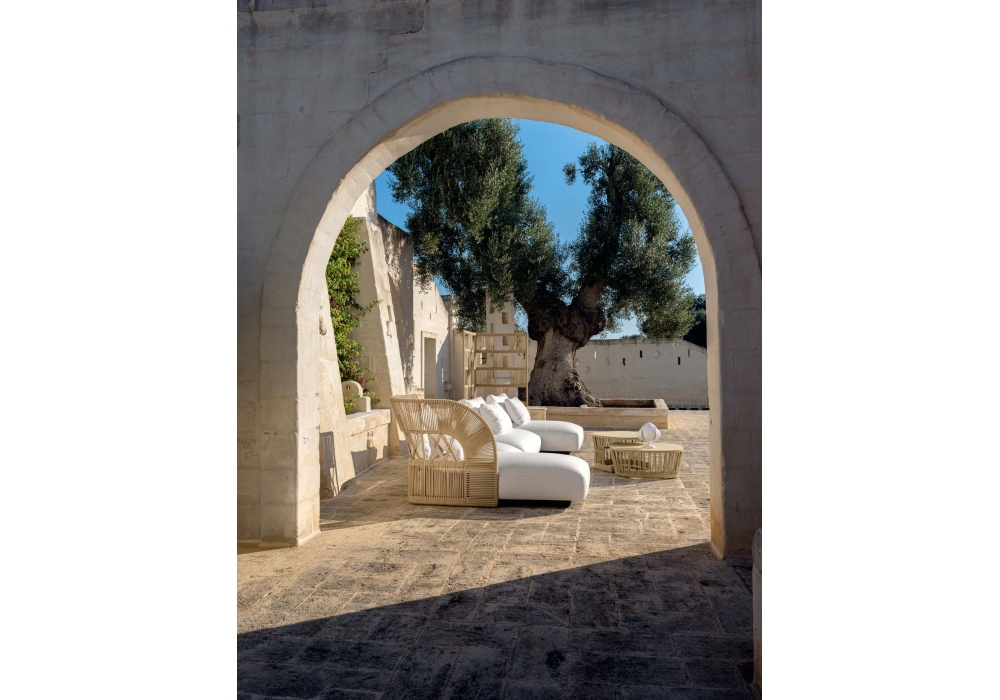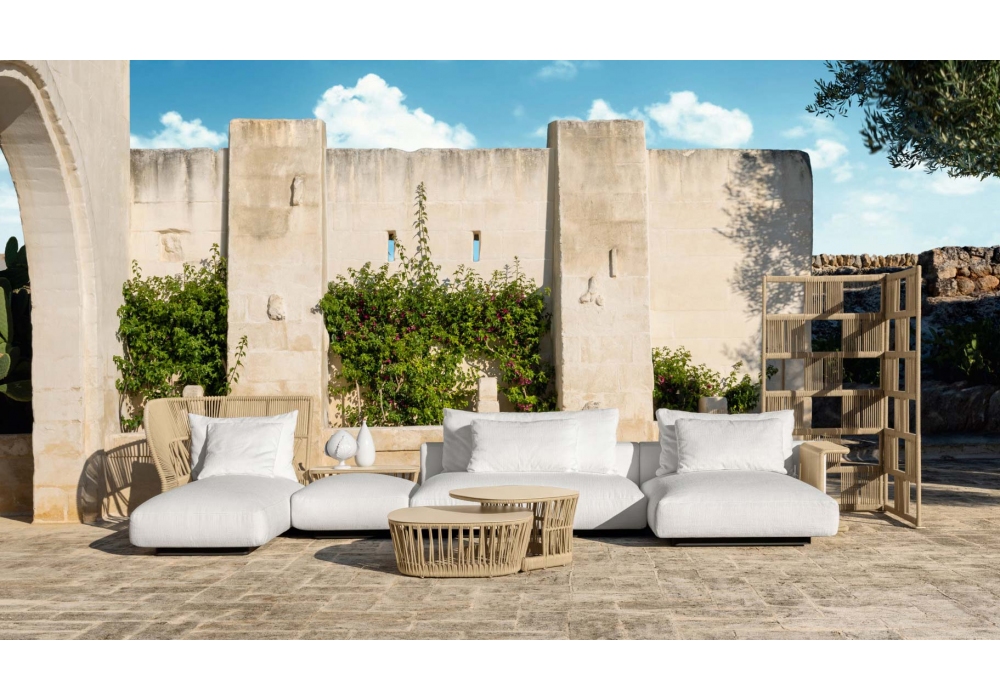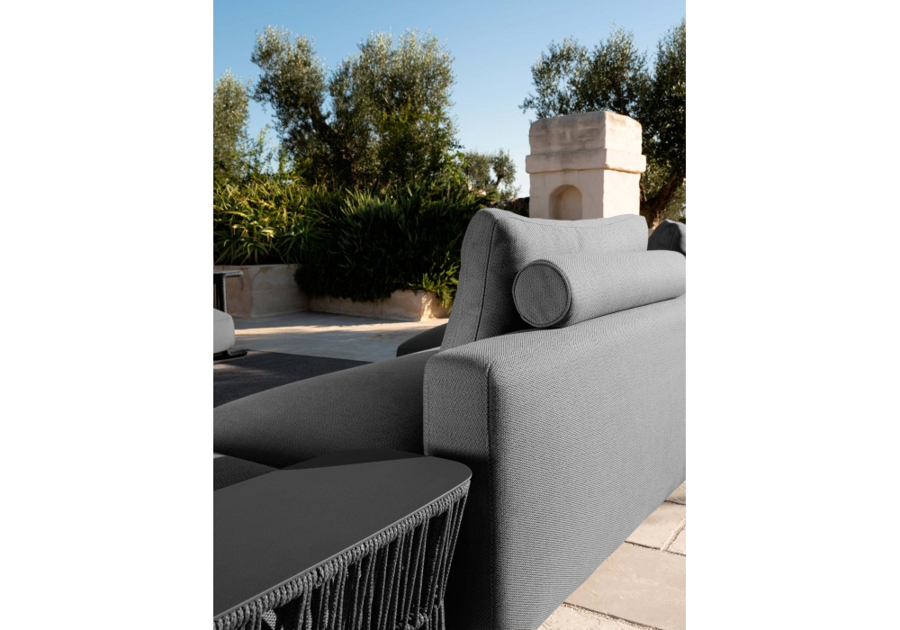Cliff Dèco conçu par Ludovica et Roberto Palomba pour Talenti est un canapé avec dossier en tissu et accoudoirs en aluminium recouvert de corde nautique dans les finitions de la collection Cliff.