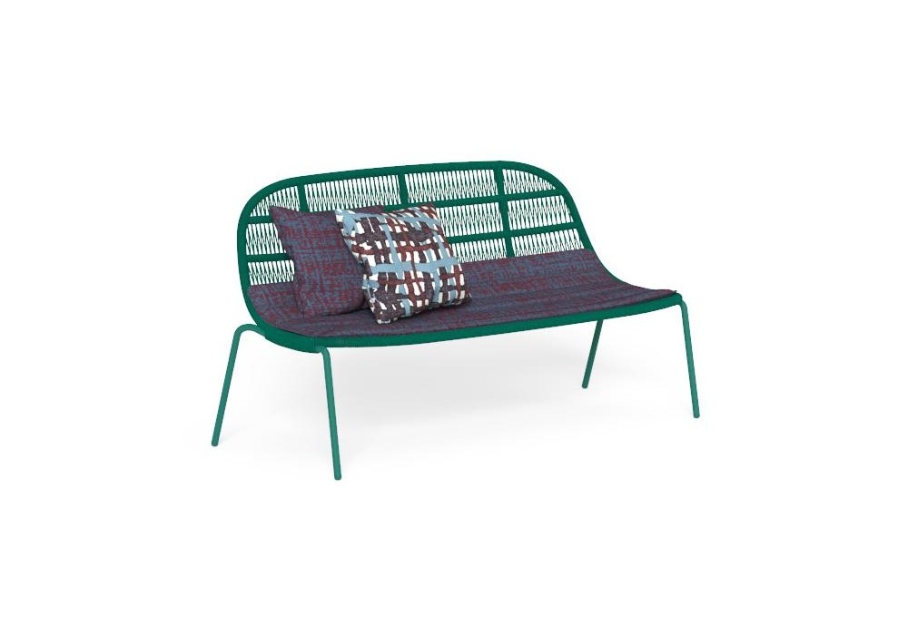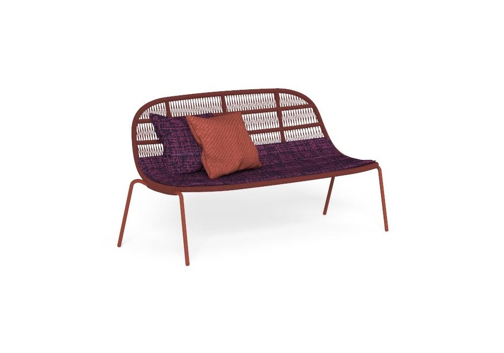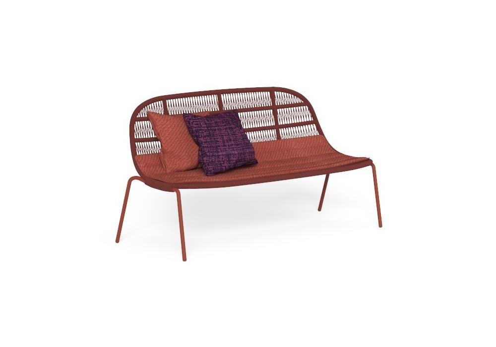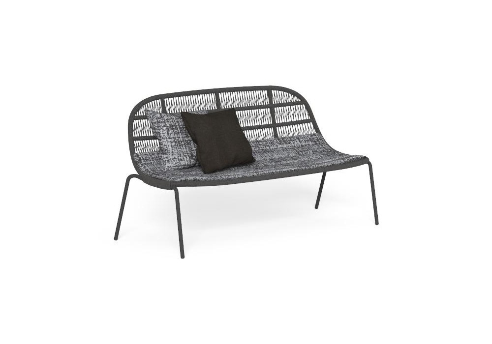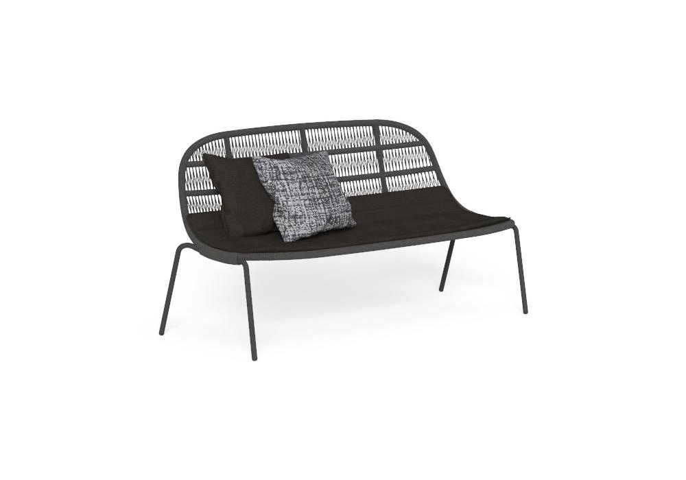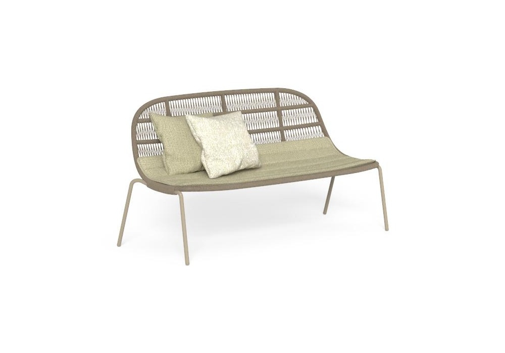 Panama Love Seat conçu par Ludovica et Roberto Palomba pour Talenti est un canapé avec structure en aluminium et corde nautique synthétique disponible en différentes couleurs, siège en option et coussins décoratifs en différentes finitions.