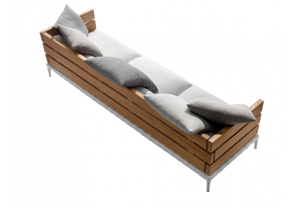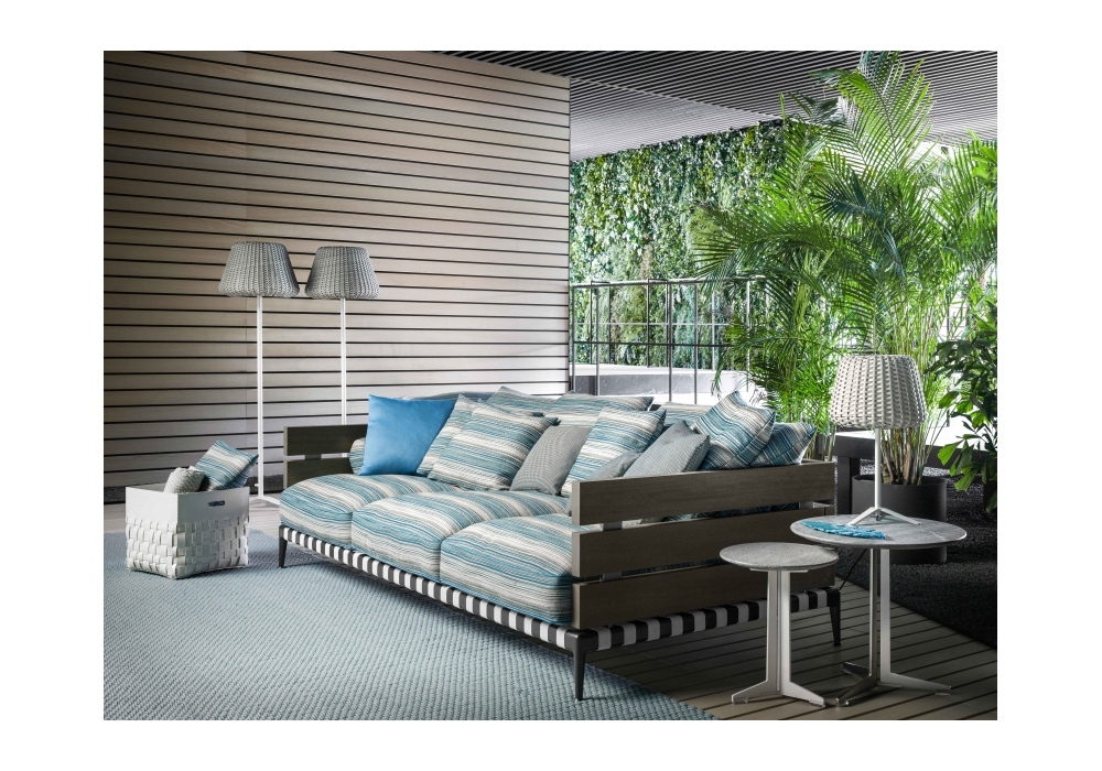Ansel conçu par Antonio Citterio pour Flexform est un canapé appartenant à la collection Outdoor. Base en aluminium, dossier et accoudoir bois massif. Coussin d'assise et de dossier en tissu hydrofuge. Disponible en deux profondeurs.