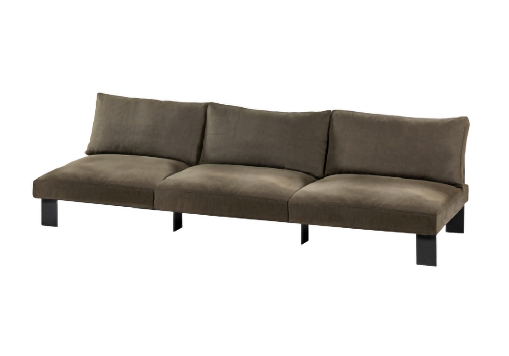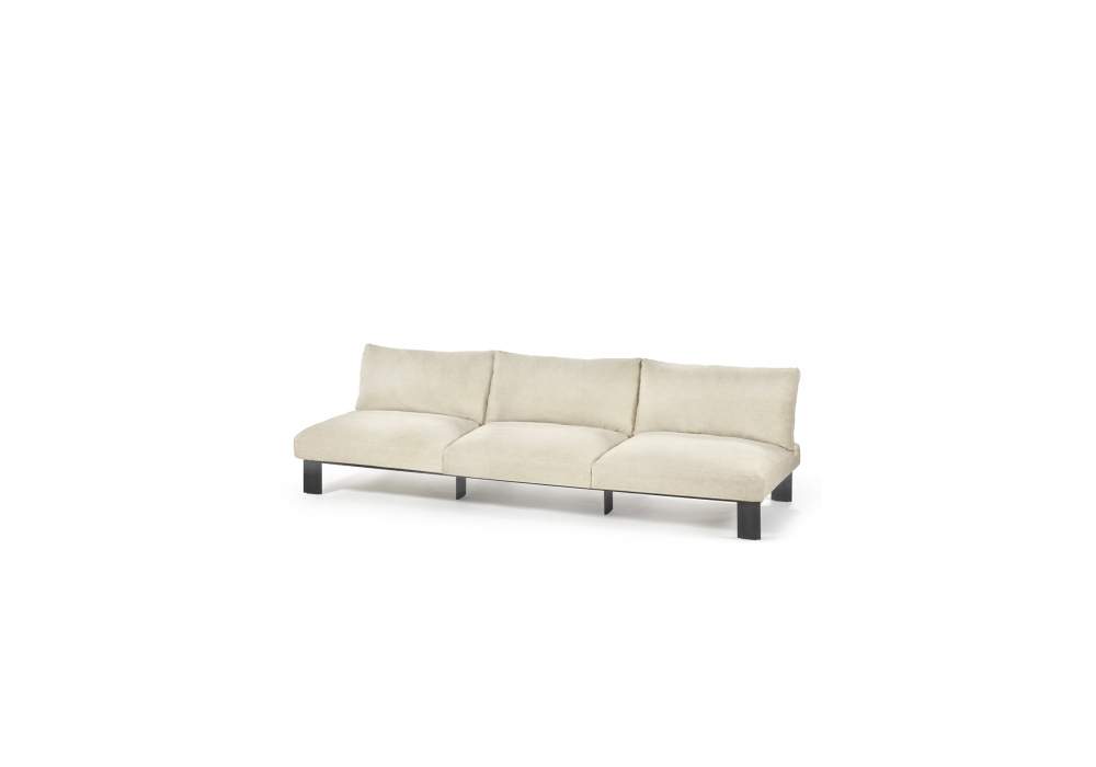 Bench Three conçu par Bea Mombaers pour Serax est un canapé d'extérieur, avec structure de support composée de carrés d'aluminium peints en noir. Le rembourrage est disponible en différentes finitions.