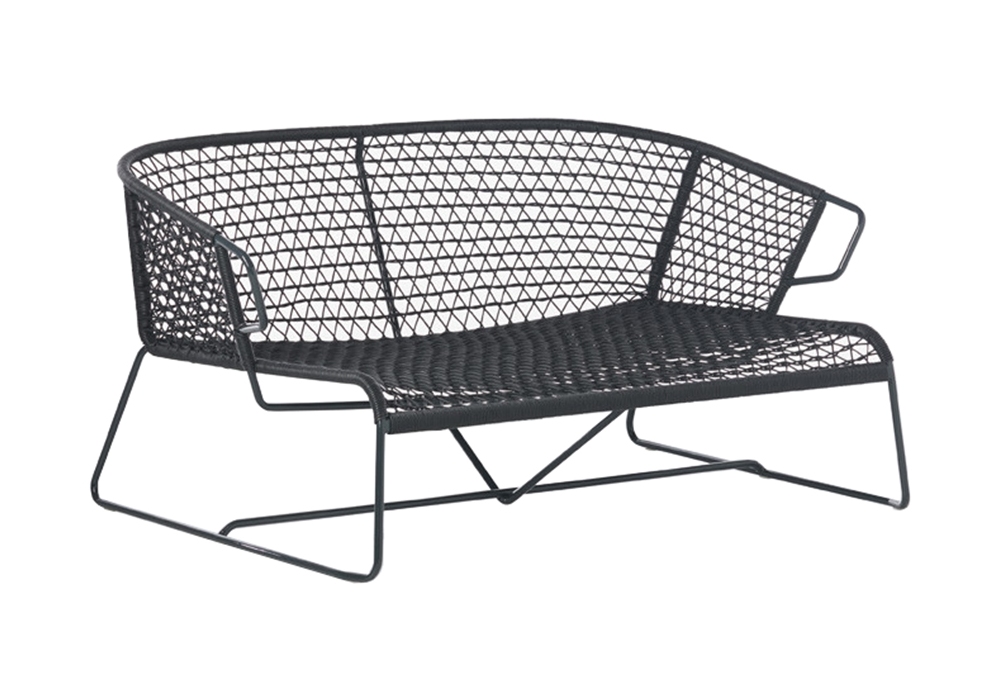 Vela conçu par Hannes Wettstein pour Potocco est un canapé d'extérieur structuré entièrement en métal peint en différentes finitions. L'assise et le dossier sont recouverts d'un tressage en corde de chanvre ou de PVC de différentes couleurs.